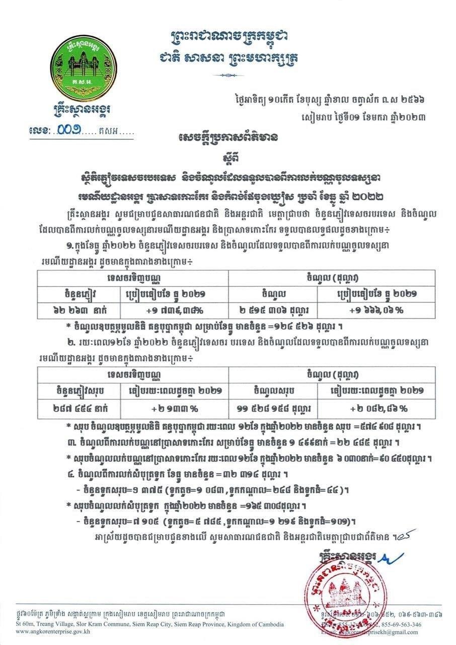 (សៀមរាប)៖ ពេញមួយឆ្នាំ២០២២ ចំណូលដែលទទួលបានពីការលក់បណ្ណ ជូនភ្ញៀវទេសចរបរទេស ចូលទស្សនារមណីយដ្ឋានអង្គរបានចំនួន ១១ ៥២៨ ១៥៨ដុល្លារ កើនឡើង២០៨២% បើធៀបនឹងរយៈពេលដូចគ្នា ឆ្នាំ២០២១ ហើយសម្រាប់ភ្ញៀវទេសចរវិញ មានចំនួន ២៨៧ ៤៥៤នាក់ កើនឡើង ២១៣៣%។ នេះបើតាមសេចក្តីប្រកាសព័ត៌មាន របស់គ្រឹះស្ថានអង្គរ ដែលបណ្តាញព័ត៌មាន Fresh News ទទួលបាននៅថ្ងៃទី៥ ខែមករា ឆ្នាំ២០២៣នេះ។
