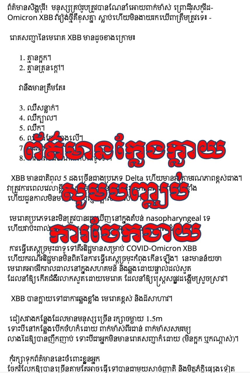 សូមជម្រាបថា កន្លងទៅថ្មីៗនេះ មានការចែកចាយព័ត៌មាន ពាក់ព័ន្ធការរកឃើញវីរុសកូវីដ១៩ ប្រភេទថ្មី XBB ហើយគេអះអាងថា មានជាតិពុល៥ដងច្រើនជាងប្រភេទ Delta ហើយមានអត្រាមរណភាពខ្ពស់ជាង។ វាត្រូវការពេលវេលាខ្លីជាងសម្រាប់ស្ថានភាពនេះឈានដល់ភាពធ្ងន់ធ្ងរខ្លាំង ហើយជួនកាលមិនមានរោគសញ្ញាច្បាស់លាស់ទេ។ ដូច្នេះហើយទើបក្រសួងសុខាភិបាលចេញមកច្រានចោលតែម្ដង៕ ផ្តល់សិទ្ធិដោយ៖ freshnews