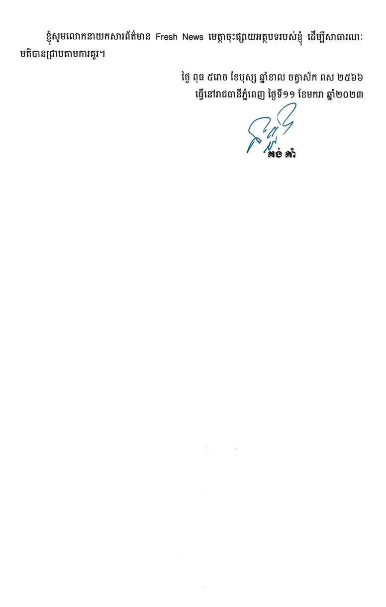 «ខ្ញុំបានទទួលព័ត៌មានតាមហ្រ្វេសញ៉ូអំពីលិខិតរបស់លោក គង់ គាំ បំភ្លឺអំពីដំណើររឿងទាក់ទងនឹងដីនិងផ្ទះដែលជាកម្មសិទ្ធិរបស់ក្រសួងការបរទេស។ ខ្ញុំទទួលស្គាល់ថា អ្វីដែលលោក គង់ គាំ បានរៀបរាប់ក្នុងលិខិតនោះ ភាគច្រើន ជាការពិត ពិសេស ត្រង់ចំណុចចុងក្រោយក្នុងលិខិតដែលលោក គង់ គាំ បញ្ជាក់យ៉ាងច្បាស់ថា “ខ្ញុំចាំថាពេលសម្រេចចិត្តចូលមករស់នៅក្នុងផ្ទះនេះ ខ្ញុំពិតជាបានជូនព័ត៌មានចំពោះលោករដ្ឋមន្រ្តី ដោយមិនអាចខ្វះការគួរសមនោះឡើយ ហើយលោករដ្ឋមន្រ្តីក៏បានយោគយល់រហូតមក។”
