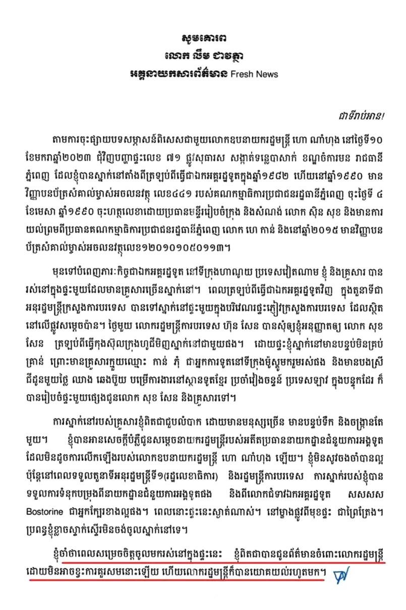 ខ្ញុំសូមបញ្ជាក់ថា ខ្ញុំពិតជាមានការយោគយល់ចំពោះស្នាក់នៅនៅផ្ទះរបស់ក្រសួងការបរទេស ប៉ុន្តែ ខ្ញុំពុំដែលបានសម្រេចប្រគល់ផ្ទះ និងដីនោះឱ្យលោក គង់ គាំ ធ្វើជាកម្មសិទ្ធិឯកជននោះទេ ហើយផ្ទះ និងដីនោះ នៅតែជាកម្មសិទ្ធិរបស់ក្រសួងការបរទេសដដែល។ រាល់ការរៀបចំឯកសារនានារបស់លោក គង់ គាំ ដើម្បីធ្វើប័ណ្ណកម្មសិទ្ធិលើដីនេះ គឺជាក្លែងបន្លំយកដីនិងផ្ទះរបស់រដ្ឋ ធ្វើជាកម្មសិទ្ធិឯកជន។