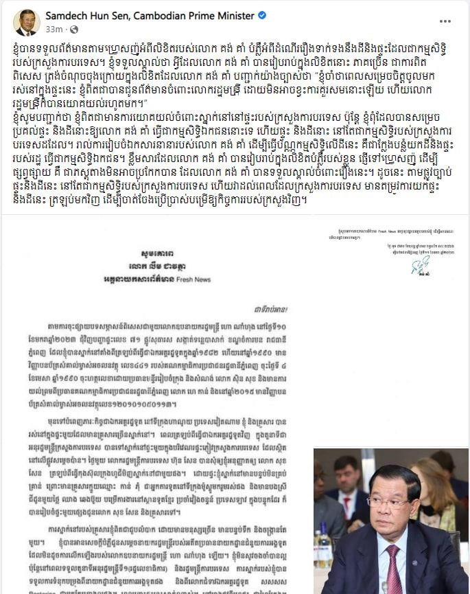 ការចេញមកបញ្ជាក់របស់សម្តេចតេជោ ហ៊ុន សែន បានធ្វើឡើងតែប៉ុន្មាននាទីប៉ុណ្ណោះ បន្ទាប់ពីលោក គង់ គាំ បានធ្វើលិខិតបំភ្លឺពីប្រវត្តិនៃការចូលរស់នៅក្នុងផ្ទះ និងដី ដែលជាកម្មសិទ្ធិរបស់ក្រសួងការបរទេស ស្ថិតនៅតាមបណ្តោយវិថីព្រះសុធារស សង្កាត់ទន្លេ បាសាក់ ខណ្ឌចំការមន។