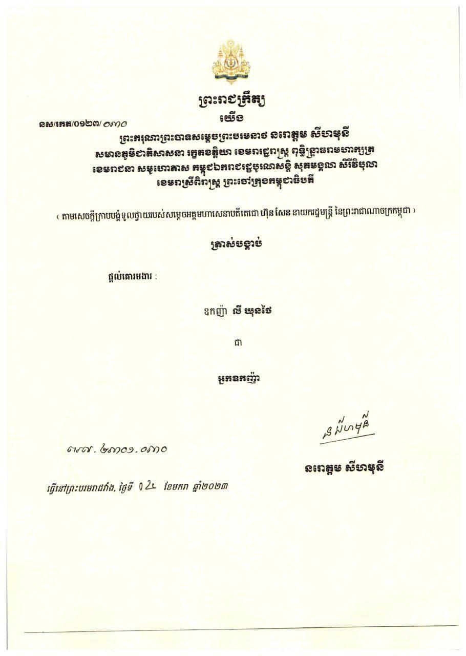 – លោកឧកញ៉ា លី ឃុនថៃ អនុប្រធានសភាពាណិជ្ជកម្មកម្ពុជា ប្រធានសមាគមផលិតស្បែកជើងកម្ពុជា និងជាទីប្រឹក្សាសម្ដេចអគ្គមហាសេនាបតីតេជោ ហ៊ុន សែន នាយករដ្ឋមន្ដ្រី នៃព្រះរាជាណាចក្រកម្ពុជា ទទួលបានការផ្ដល់គោរមងារថ្មីជា «អ្នកឧកញ៉ា» ដោយព្រះរាជក្រឹត្យលេខ នស/រកត/០១២៣/០៣០ ចុះថ្ងៃទី០៤ ខែមករា ឆ្នាំ២០២៣៕