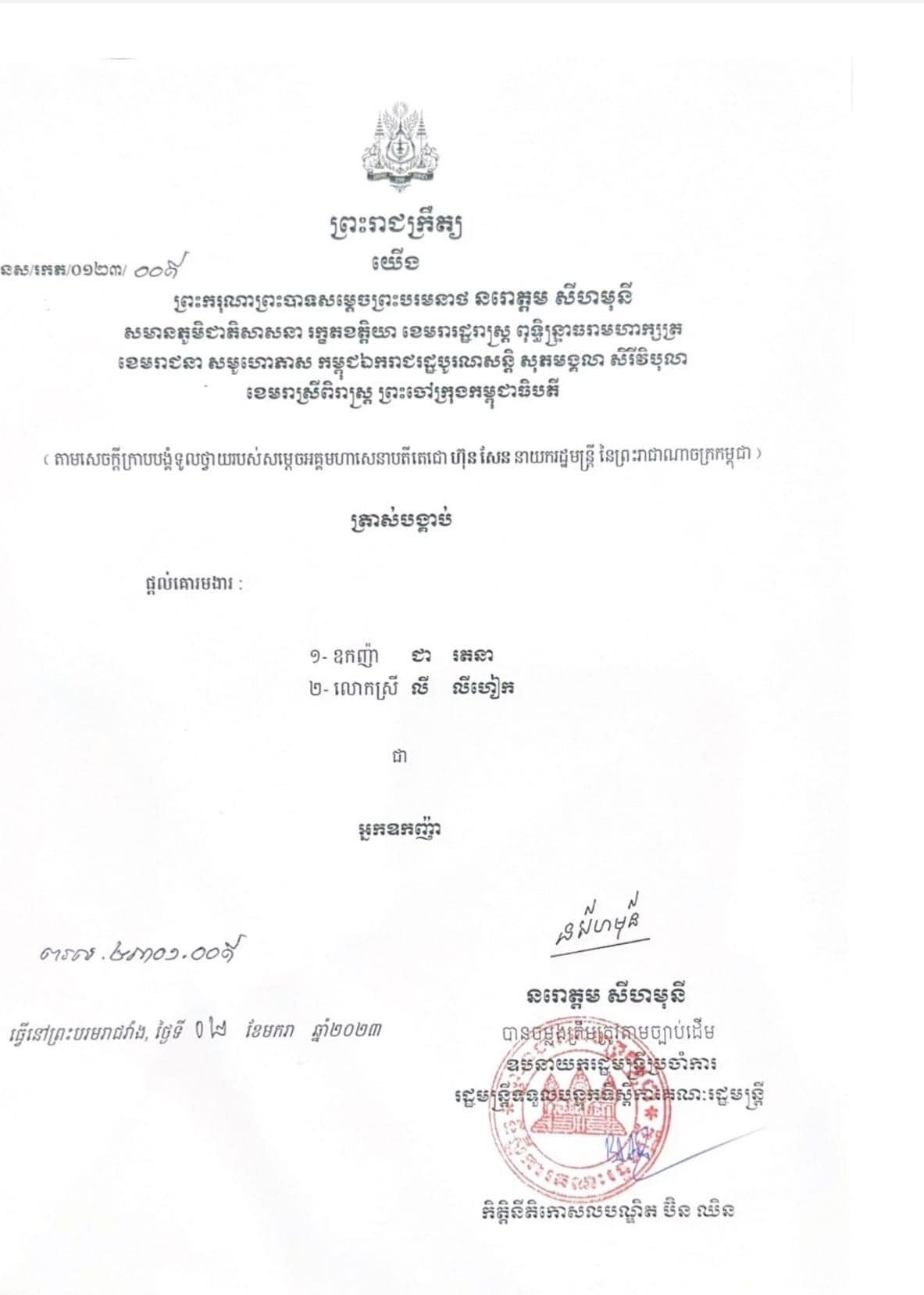 – លោកឧកញ៉ា ជា រតនា និងលោកស្រី លី លីហៀក អគ្គនាយកក្រុមហ៊ុន សាន់ & មូន គ្រុប ទទួលបានការផ្ដល់គោរមងារថ្មីជា «អ្នកឧកញ៉ា» ដោយព្រះរាជក្រឹត្យលេខ នស/រកត/០១២៣/០០៩ ចុះថ្ងៃទី០២ ខែមករា ឆ្នាំ២០២៣។