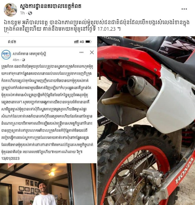 បើយោងតាមទំព័រហ្វេសប៊ុកផេក ស្នងការដ្ឋាននគរបាលខេត្តកំពត បានសរសេររៀបរាប់ថា៖ «ឯកឧត្តម អភិបាលខេត្ត បានឯកភាពប្រគល់ម៉ូតូរបស់ជនជាតិជប៉ុនដែលបើកបង្កសំលេងរំខានក្នុងក្រុងកំពតវិញហើយ គាត់នឹងមកយកម៉ូតូនៅថ្ងៃទី 17.01.23»។