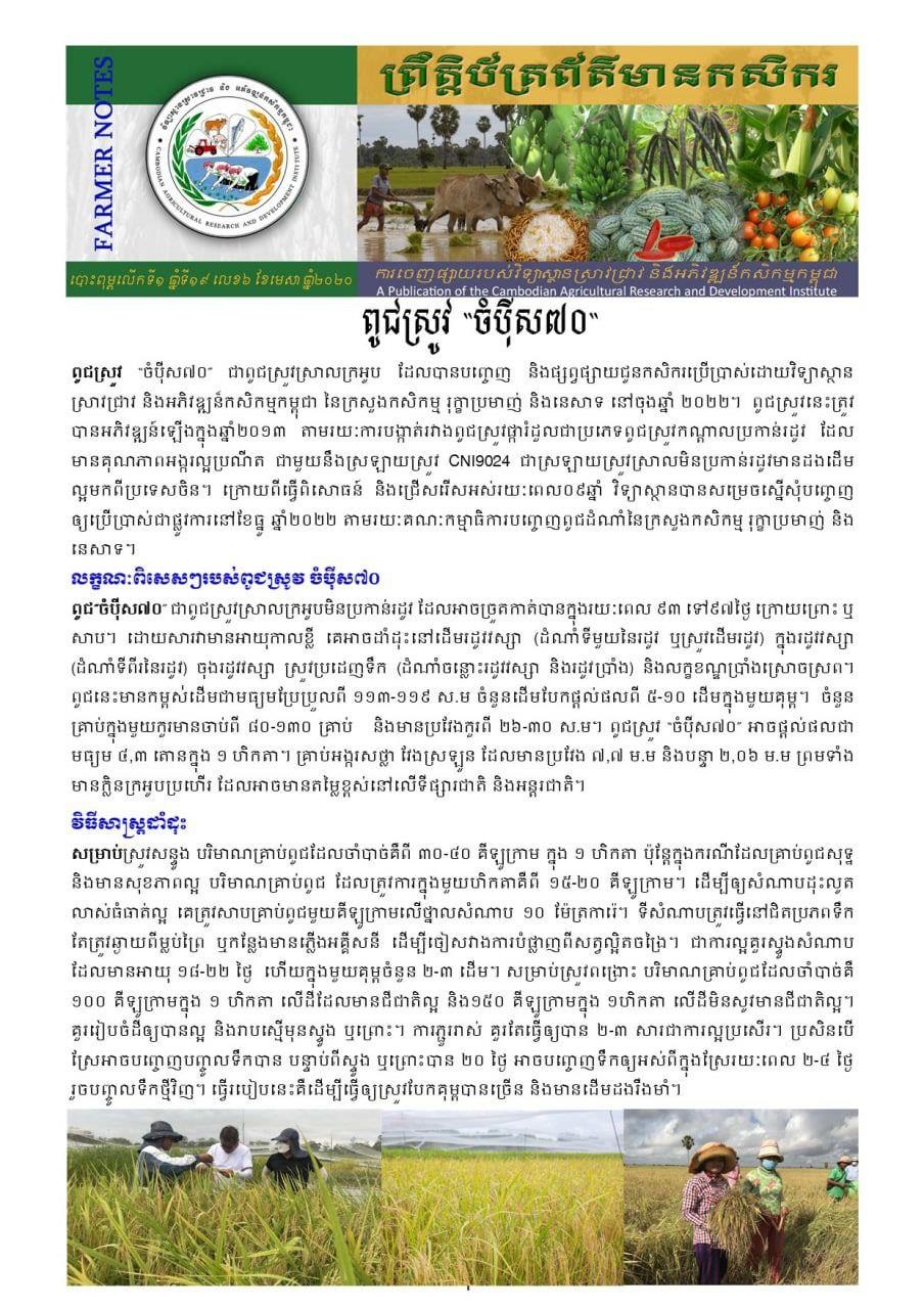 លោក អន ឈួន អនុប្រធានការិយាល័យរុក្ខជម្រើសវិទ្យា នៃវិទ្យាស្ថានស្រាវជ្រាវ និងអភិវឌ្ឍន៍កសិកម្មកម្ពុជា( CARDI) ដែលជាអ្នកស្រាវជ្រាវពូជស្រូវមួយរូបបានឱ្យដឹងថា នៅចុងឆ្នាំ២០២២ ក្រសួងកសិកម្ម រុក្ខាប្រមាញ់ និងនេសាទ តាមរយៈ វិទ្យាស្ថានស្រាវជ្រាវ និងអភិវឌ្ឍន៍កសិកម្មកម្ពុជា( CARDI) បានបញ្ចេញពូជស្រូវថ្មីមួយប្រភេទ ដែលមានឈ្មោះថា ចំប៉ីស៧០ ដជាប្រភេទស្រូវស្រាលក្រអូប។