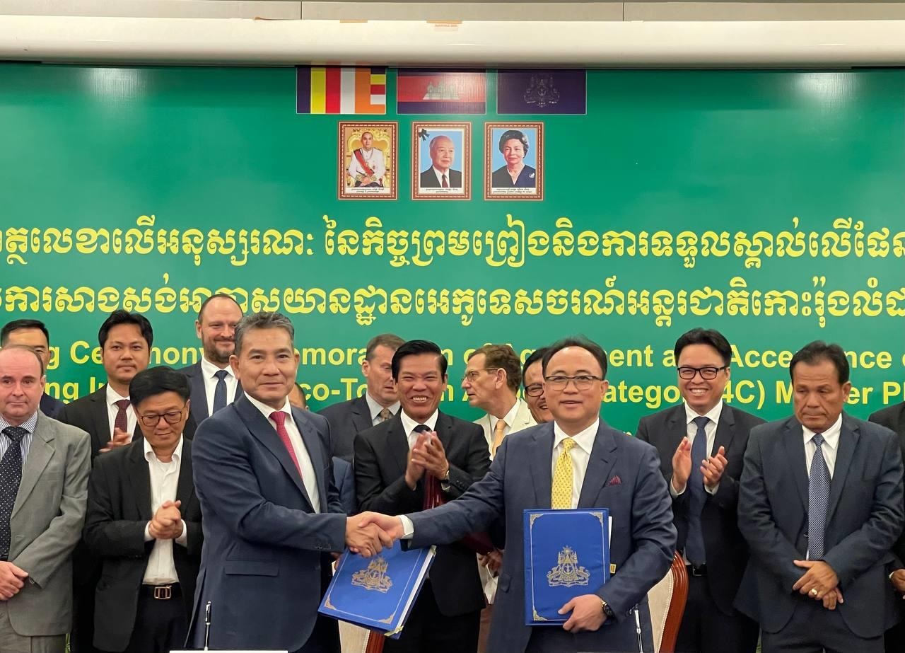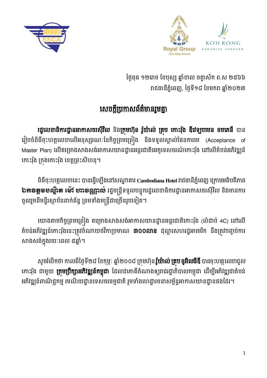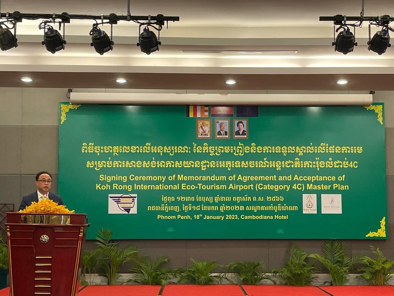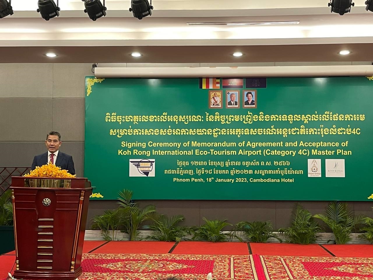 (ភ្នំពេញ)៖ រដ្ឋលេខាធិការដ្ឋានអាកាសចរស៊ីវិល និងក្រុមហ៊ុន រ៉ូយ៉ាល់ គ្រុប កោះរ៉ុង ឌីវេឡបមេន ខមភេនី នៅថ្ងៃទី១៨ ខែមករា ឆ្នាំ២០២៣នេះ បានរៀបចំពិធីចុះហត្ថលេខាលើអនុស្សរណៈនៃកិច្ចព្រមព្រៀង និងទទួលស្គាល់ផែនការមេ (Acceptance of Master Plan) លើគម្រោងសាងសង់អាកាសយានដ្ឋានអន្តរជាតិអេកូទេសចរណ៍កោះរ៉ុង នៅលើតំបន់អភិវឌ្ឍន៍កោះរ៉ុង ក្រុងកោះរ៉ុង ខេត្តព្រះសីហនុ។