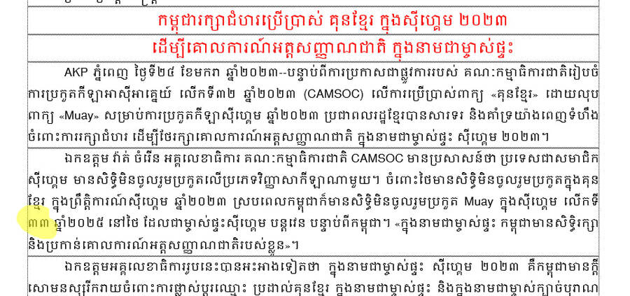ឯកឧត្តមអគ្គលេខាធិការរូបនេះបានអះអាងទៀតថា ក្នុងនាមជាម្ចាស់ផ្ទះ ស៊ីហ្គេម ២០២៣ គឺកម្ពុជាមានក្តីសោមនស្សរីករាយចំពោះការផ្លាស់ប្តូរឈ្មោះ ប្រដាល់គុនខ្មែរ ក្នុងនាមជាម្ចាស់ផ្ទះ និងក្នុងនាមជាម្ចាស់ក្បាច់បុរាណគុនខ្មែរ និងជាប្រភេទកីឡាជាអត្ដសញ្ញាណជាតិ។ ការប្រកាសជំហរដ៏រឹងមាំនេះ ទទួលបានការសាទរ និងស្របតាមក្តីប្រាថ្នាដ៏ធំរបស់ប្រជាពលរដ្ឋខ្មែរទូទាំងប្រទេស ហើយចំពោះរឿងមិនពេញចិត្ត និងការមិនចូលរួមរបស់សមាជិកថៃ លើវិញ្ញាសានេះក្តី ក៏ដំណើរដើរឆ្ពោះទៅមុខ នៃការប្រើប្រាស់ «គុនខ្មែរ» ដោយលុបចោលពាក្យ Muay នៅតែដំណើរការដោយរលូន។ ព្រោះកម្ពុជាទទួលបានការគាំទ្រ និងចូលរួមចំនួន៦ប្រទេស លើប្រភេទគុនខ្មែរនេះ ដូចជា ឥណ្ឌូណេស៊ី, វៀតណាម, ហ៊្វីលីពីន, ឡាវ, មីយ៉ាន់ម៉ា និងម៉ាឡេស៊ី។ តាមធម្មនុញ្ញស៊ីហ្គេម ដែលជាគោលការណ៍កំពូលនៃស៊ីហ្គេម ឱ្យតែមាន៤ប្រទេសចូលរួមគាំទ្រ និងចូលរួម ប្រភេទកីឡាណាមួយនោះនឹងអាចរៀបចំការប្រកួតដោយស្របទៅនឹងគោលការណ៍ធម្មនុញ្ញនៃស៊ីហ្គេម។