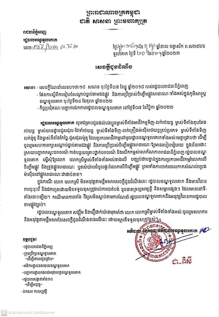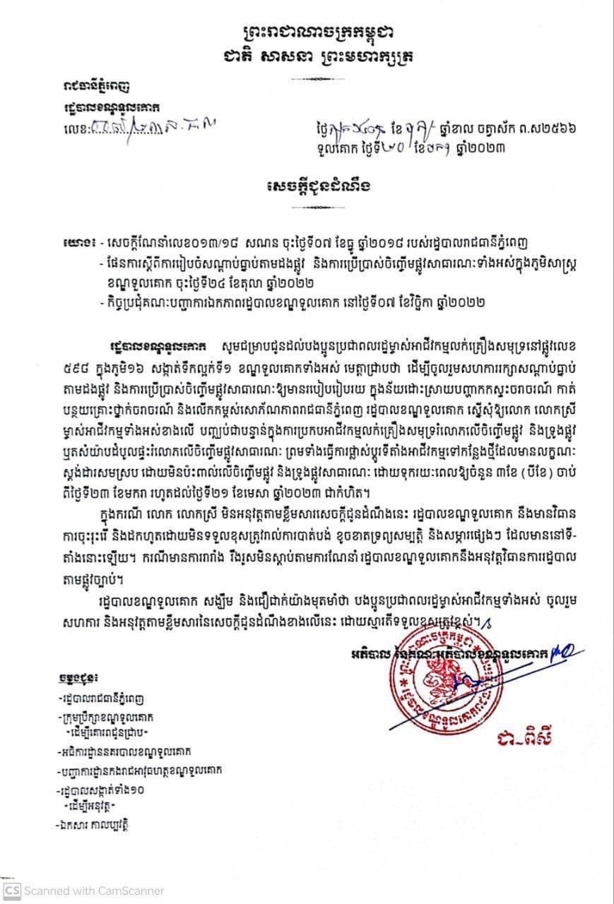ជូនដំណឹង! អាជ្ញាធរទុករយៈពេល៣ខែជាកំហិតឲ្យម្ចាស់អាជីវកម្មលក់គ្រឿងសមុទ្រនៅផ្លូវ៥៩៨ ម្ចាស់អាជីវកម្មទិញលក់រថយន្ដ និងម៉ូតូទាំងអស់នៅខណ្ឌទួលគោក បញ្ឈប់ជាបន្ទាន់ការប្រើប្រាស់ចិញ្ចើមផ្លូវ និងទ្រូងផ្លូវ