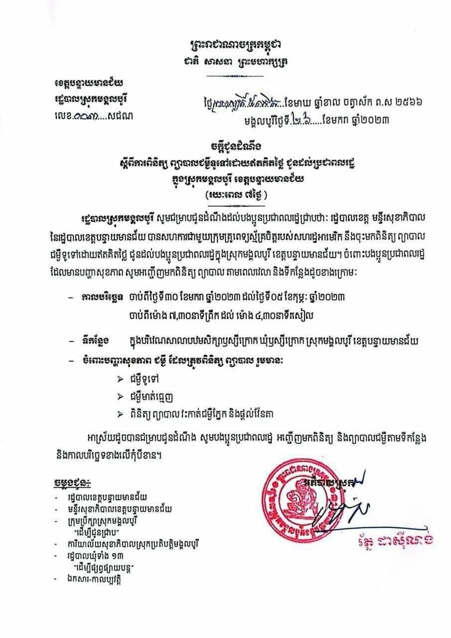 (បន្ទាយមានជ័យ)៖ រដ្ឋបាលស្រុកមង្គលបូរី នៅថ្ងៃ២៧ ខែមករា ឆ្នាំ២០២៣នេះ បានជូនដំណឹងដល់ប្រជាពលរដ្ឋរស់នៅក្នុងស្រុកមង្គលបូរី ឲ្យដឹងថា ក្រុមគ្រូពេទ្យស្ម័គ្រចិត្ត មកពីអាមេរិក នឹងមកព្យាលជំងឺទូទៅ វះកាត់ មាត់ធ្មេញ ភ្នែក និងផ្តល់វែនតាឥតគិតថ្លៃជូនដល់ពលរដ្ឋរស់នៅស្រុកមង្គលបូរី មានរយៈពេល៧ថ្ងៃ។