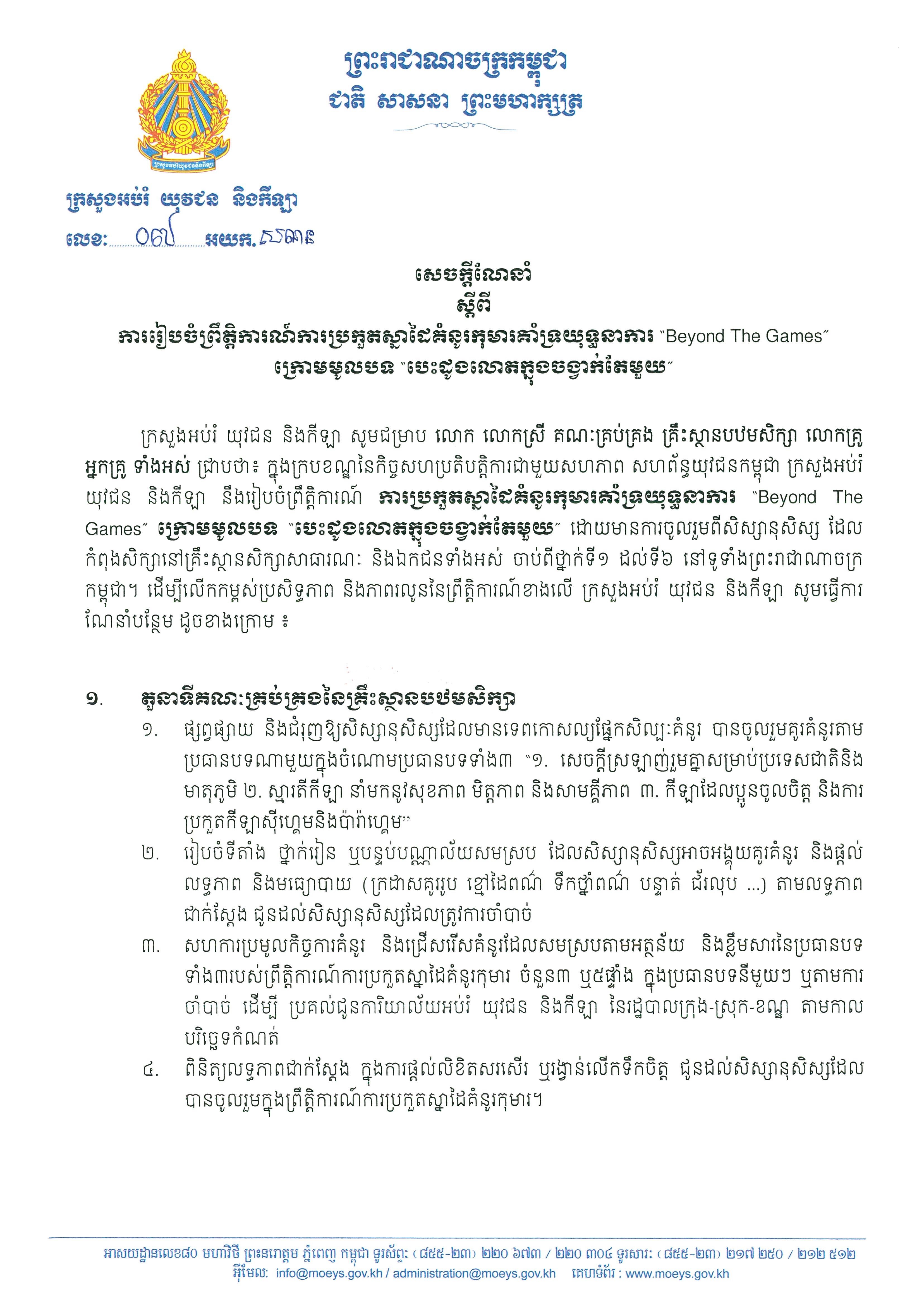 ក្រសួងអប់រំ ចេញសេចក្ដីណែនាំបន្ថែម ពីការរៀបចំព្រឹត្តិការណ៍ ប្រកួតស្នាដៃគំនូរកុមារ គាំទ្រយុទ្ធនាការ Beyond The Games