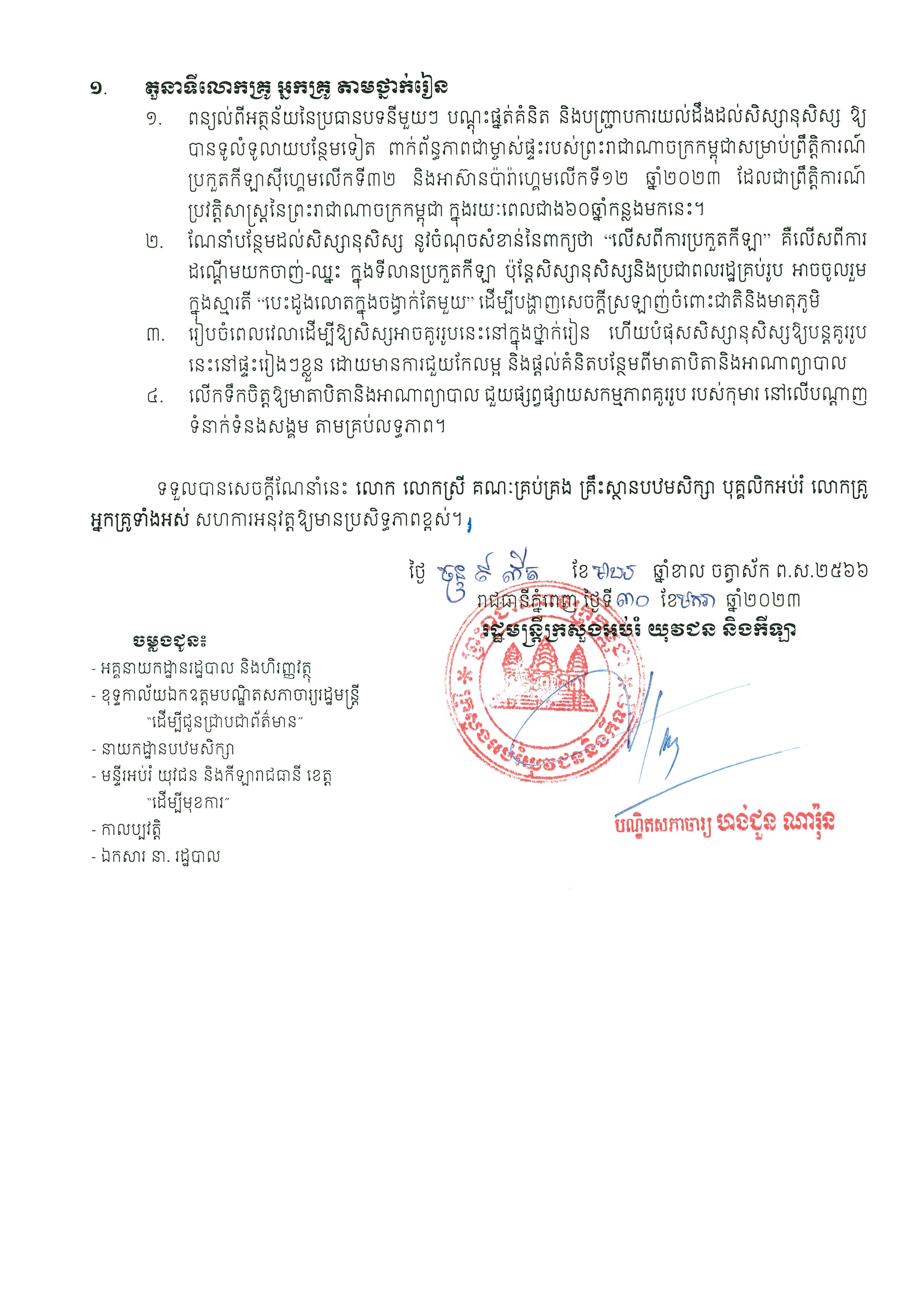 ២៖ ណែនាំបន្ថែមដល់សិស្សានុសិស្ស នូវចំណុចសំខាន់នៃពាក្យថា «លើសពីការប្រកួតកីឡា» គឺលើសពីការដណ្តើមយកចាញ់-ឈ្នះ ក្នុងទីលានប្រកួតកីឡា ប៉ុន្តែសិស្សានុសិស្សនិងប្រជាពលរដ្ឋគ្រប់រូប អាចចូលរួមក្នុងស្មារតី «បេះដូងលោតក្នុងចង្វាក់តែមួយ» ដើម្បីបង្ហាញសេចក្តីស្រឡាញ់ចំពោះជាតិនិងមាតុភូមិ