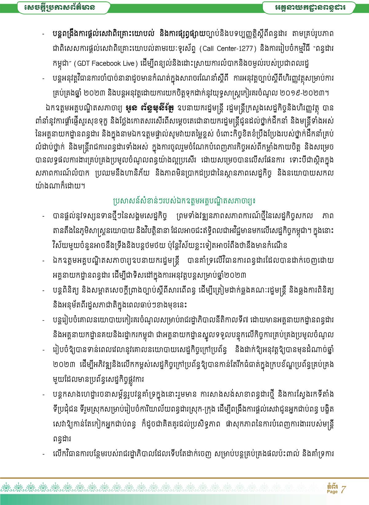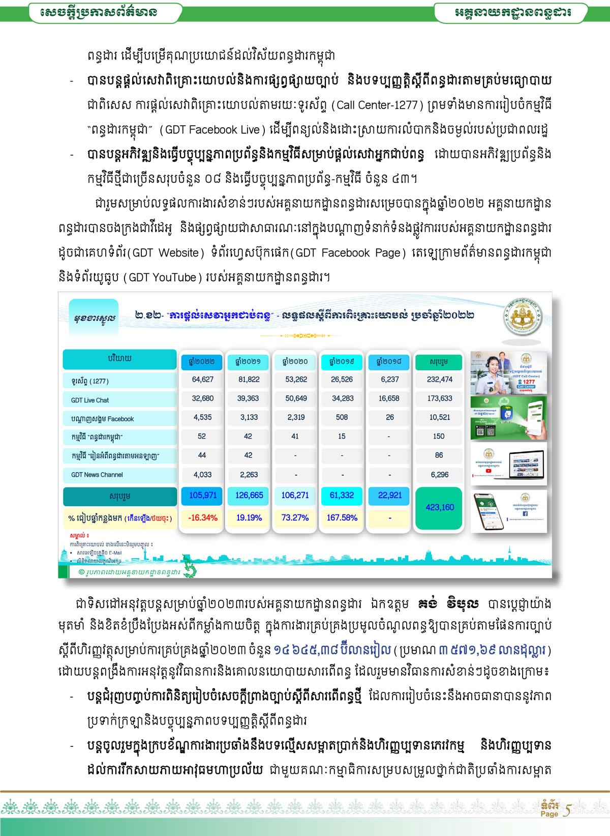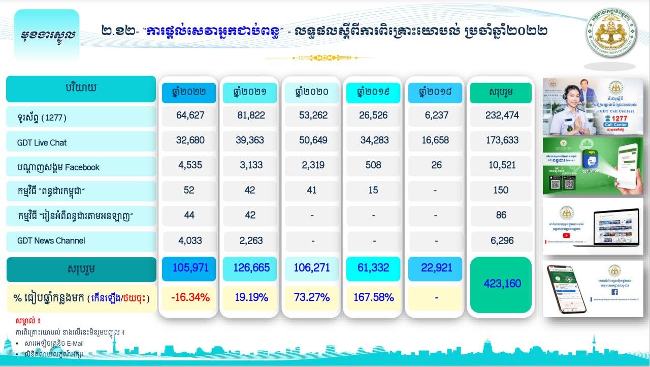* បន្ដពង្រឹងការផ្ដល់សេវាពិគ្រោះយោបល់ និងការផ្សព្វផ្សាយច្បាប់ និងបទប្បញ្ញត្តិស្ដីពីពន្ធដារ តាមគ្រប់រូបភាព ជាពិសេសការផ្ដល់សេវាពិគ្រោះយោបល់ តាមរយៈទូរស័ព្ទ (Call Center-1277) និងការរៀបចំកម្មវិធី “ពន្ធដារកម្ពុជា” (GDT Facebook Live) ដើម្បីពន្យល់និងដោះស្រាយការលំបាក និងចម្ងល់របស់ប្រជាពលរដ្ឋ