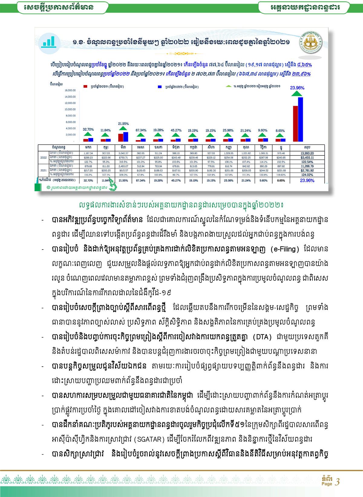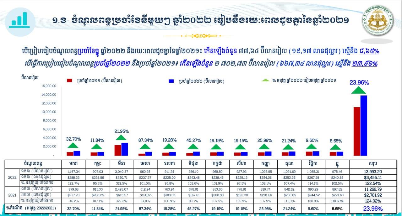 សូមចម្រាបថា នៅឆ្នាំ២០២២ ចំណូលពន្ធ-អាករ ដែលអគ្គនាយកដ្ឋានពន្ធដារ ប្រមូលបានជាក់ស្តែង តាមប្រព័ន្ធគ្រប់គ្រងទិន្នន័យចំណូលអនឡាញ របស់អគ្គនាយកដ្ឋានពន្ធដារ មានចំនួន ១៣ ៩៩៣.២០ប៊ីលានរៀល (ប្រមាណជា ៣ ៤៥៥.១១លានដុល្លារ) ស្មើនឹង១២២.៥៤% នៃផែនការច្បាប់ ស្តីពីហិរញ្ញវត្ថុសម្រាប់ការគ្រប់គ្រងប្រចាំឆ្នាំ២០២២ ធៀបនឹងចំណូលពន្ធ-អាករ ក្នុងរយៈពេលដូចគ្នា ឆ្នាំ២០២១ ឃើញថាកើនឡើងចំនួន ២ ៧០២.៧៣ ប៊ីលានរៀល (ប្រមាណជា ៦៦៧.៣៤លានដុល្លារ) ស្មើនឹង ២៣.៩៦%។