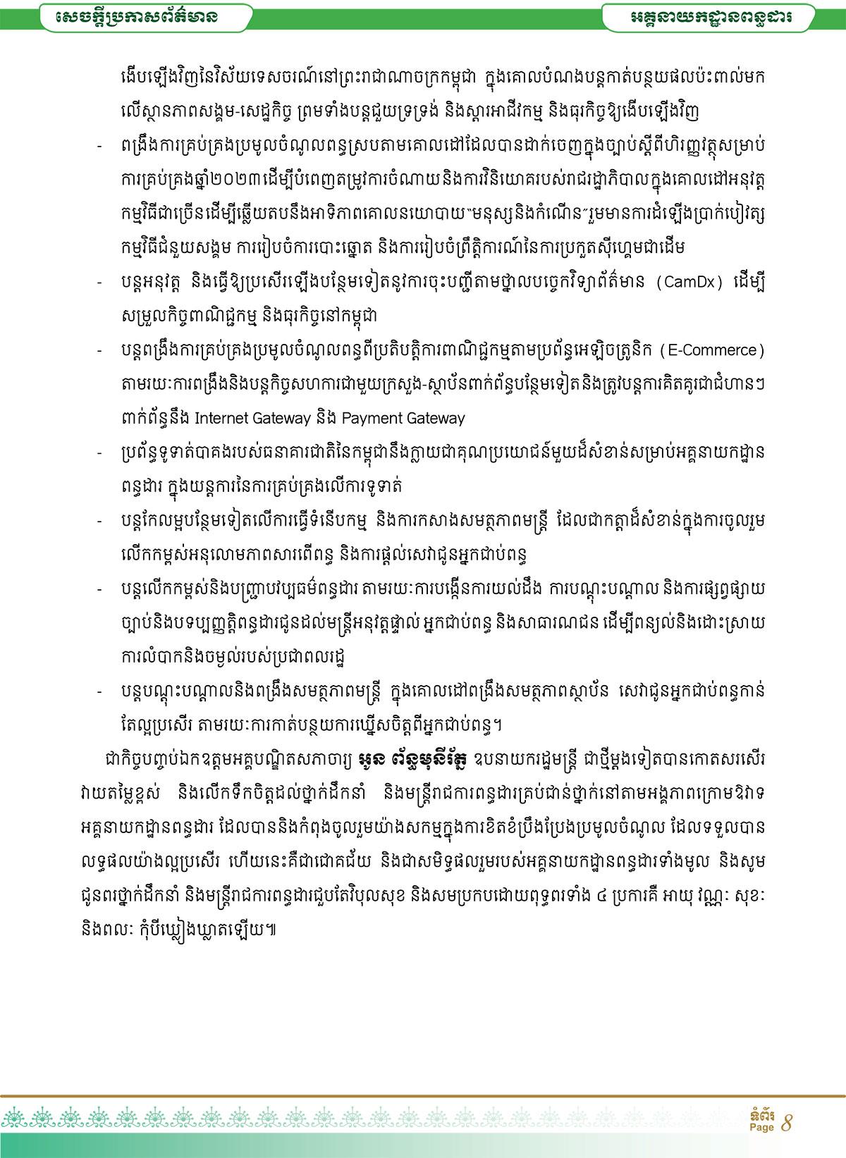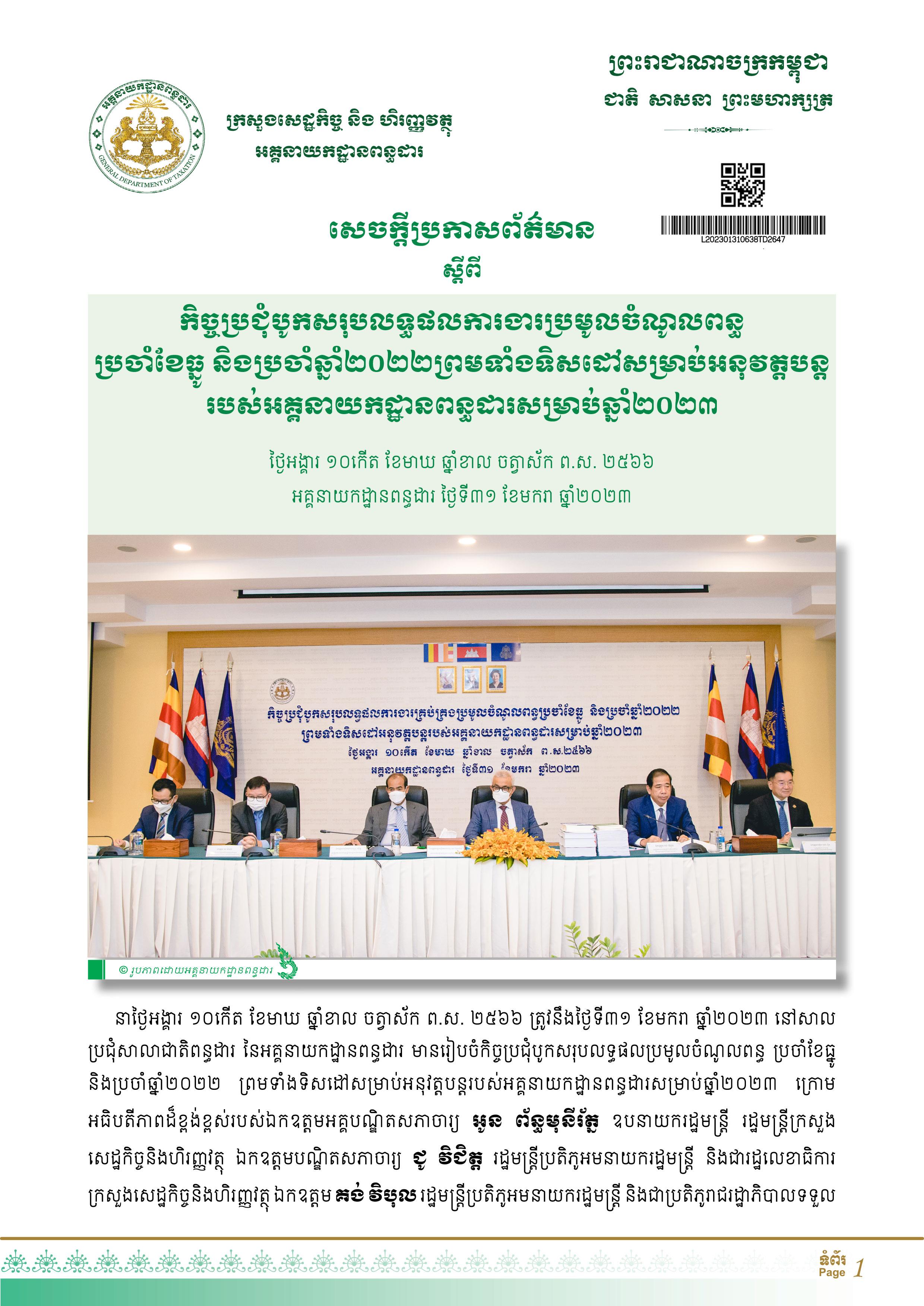 ការថ្លែងនូវការប្តេជ្ញាចិត្តនេះធ្វើឡើង ក្នុងកិច្ចប្រជុំបូកសរុបលទ្ធផលប្រមូលចំណូលពន្ធប្រចាំខែធ្នូ និងប្រចាំឆ្នាំ២០២២ ព្រមទាំងទិសដៅសម្រាប់អនុវត្តបន្ត សម្រាប់ឆ្នាំ២០២៣ ក្រោមអធិបតីភាពអគ្គបណ្ឌិតសភាចារ្យ អូន ព័ន្ធមុនីរ័ត្ន ឧបនាយករដ្ឋមន្ត្រី រដ្ឋមន្ត្រីក្រសួងសេដ្ឋកិច្ច និងហិរញ្ញវត្ថុ។