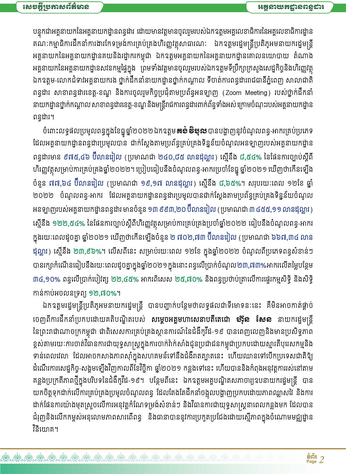 សម្រាប់រយៈពេល ១២ខែ ក្នុងឆ្នាំ២០២២ ចំណូលពីប្រភេទពន្ធសំខាន់ៗ បានរក្សាកំណើនធៀបនឹងរយៈពេលដូចគ្នាក្នុងឆ្នាំ២០២១ ក្នុងនោះ ពន្ធលើប្រាក់ចំណូល ២៣.៧៣%, អាករលើតម្លៃបន្ថែម ៣៤.១០%, ពន្ធលើប្រាក់បៀវត្ស ២២.៤៥%, អាករពិសេស ២៥.៧០%, និង ពន្ធប្រថាប់ត្រាលើការផ្ទេរកម្មសិទ្ធិ និងសិទ្ធិកាន់កាប់អចលនទ្រព្យ ១២.៧០%។