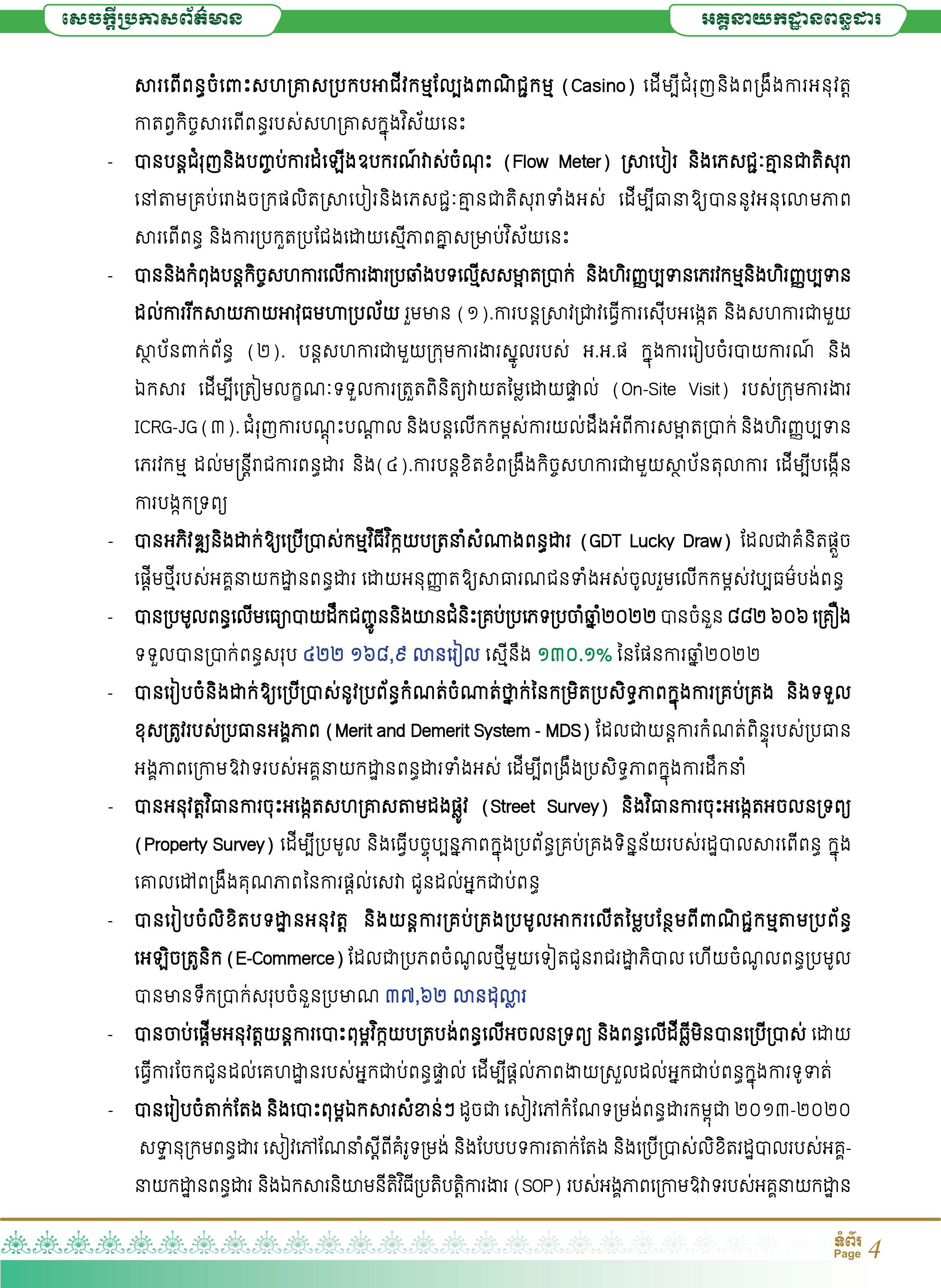 អគ្គនាយកពន្ធដារ ដាក់ចេញវិធានការសំខាន់ៗ ឈានទៅរកការសម្រេចចំណូលពន្ធ ៣ ៥៧១លានដុល្លារ ក្នុងឆ្នាំ២០២៣