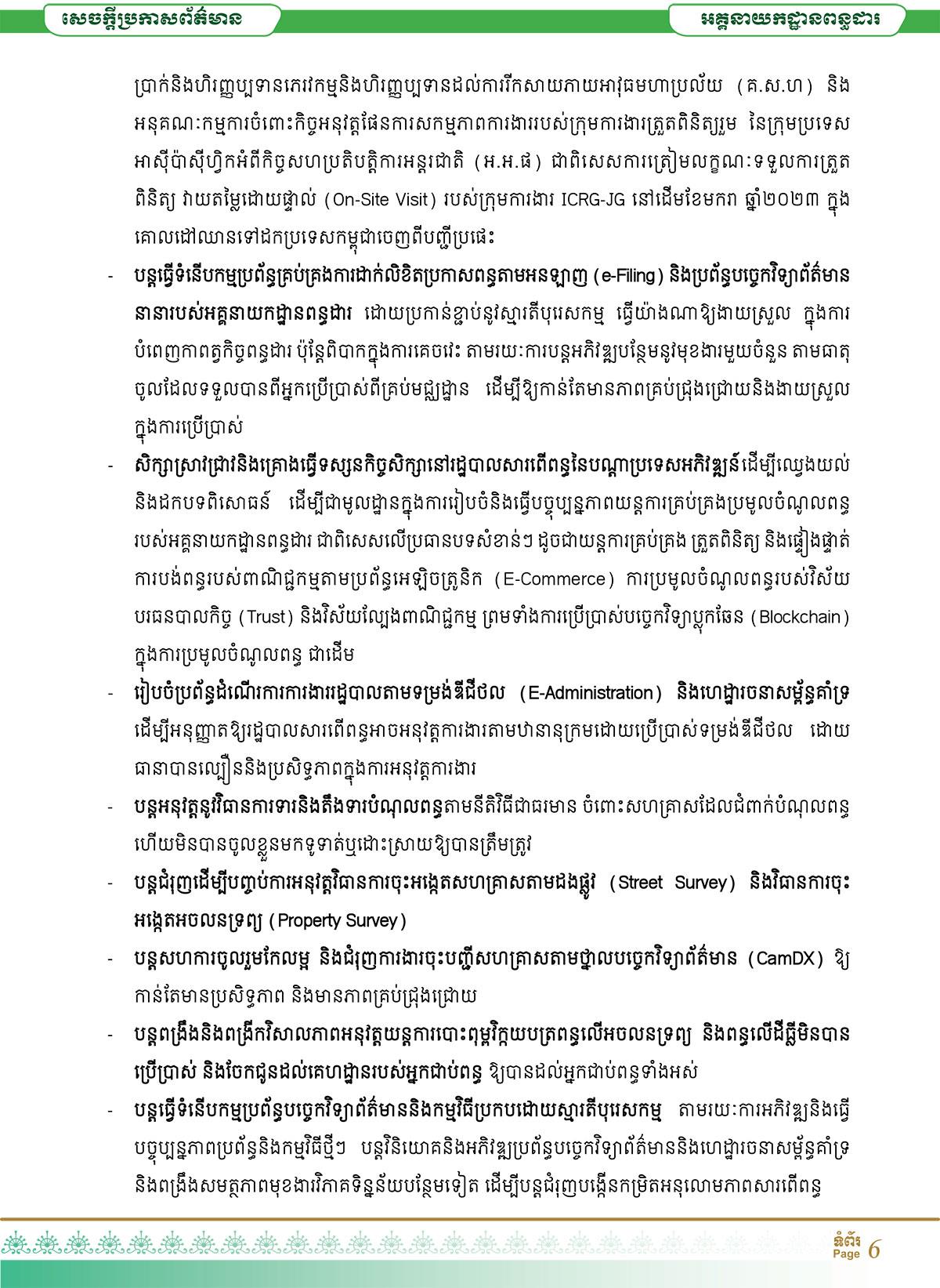 * បន្ដសហការចូលរួមកែលម្អ និងជំរុញការងារចុះបញ្ជីសហគ្រាស តាមថ្នាលបច្ចេកវិទ្យាព័ត៌មាន (CamDX) ឱ្យកាន់តែមានប្រសិទ្ធភាព និងមានភាពគ្រប់ជ្រុងជ្រោយ