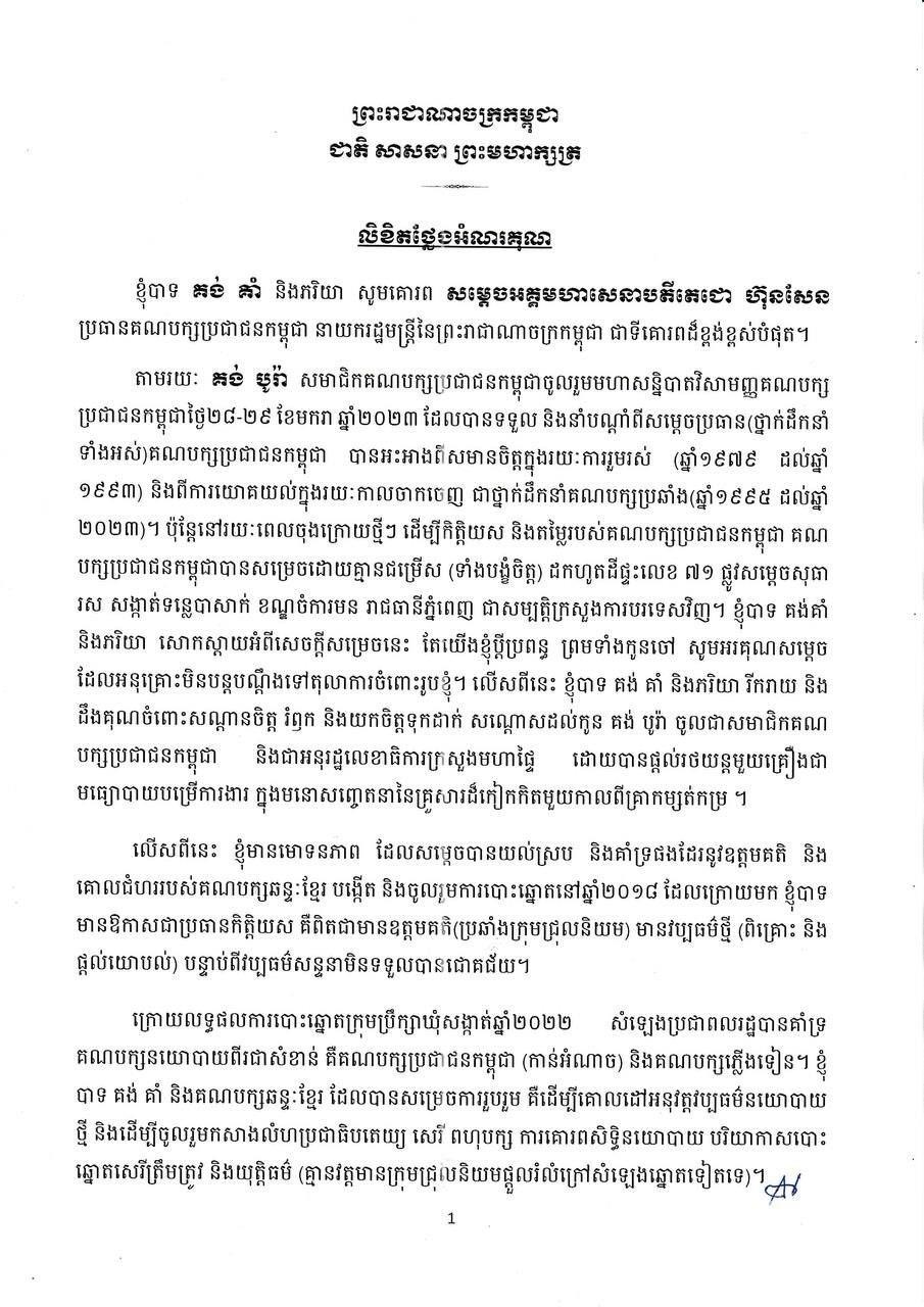 ខាងក្រោមជាលិខិតថ្លែងអំណរគុណរបស់លោក គង់ គាំ ផ្ញើជូនសម្តេចតេជោ ហ៊ុន សែន៖