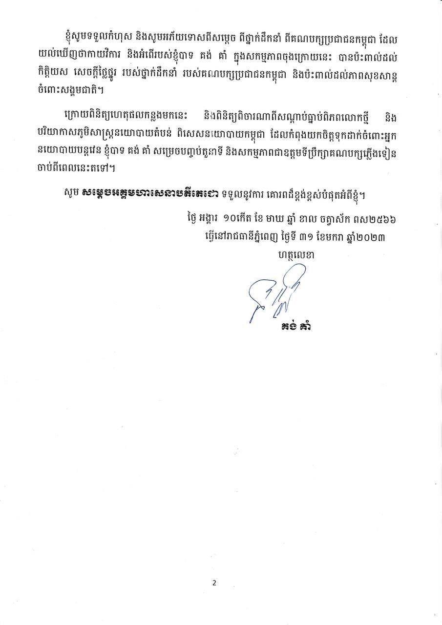 TOP NEWS: លោក គង់ គាំ ផ្ញើលិខិតថ្លែងអំណរគុណជូនចំពោះសម្តេចតេជោ ហ៊ុន សែន និងប្រកាសបញ្ចប់តួនាទី និងសកម្មភាពជាឧត្តមទីប្រឹក្សាគណបក្សភ្លើងទៀន