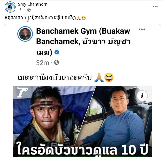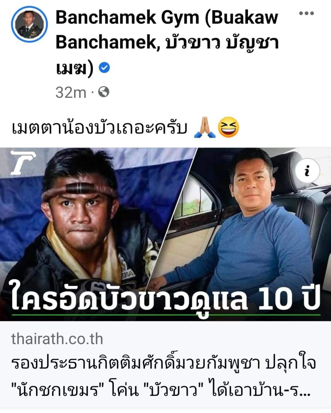 ព័ត៌មាននេះបានល្បីសុះសាយដល់សារព័ត៌មានថៃ ហើយ កីឡាករប្រដាល់ថៃ ប៊ូ ខាវ ក៏បានឆ្លើយតបមកវិញតាមរយៈទំព័រហ្វេសប៊ុកផេករបស់ខ្លួនថា «សូមមេត្តាប្រោសប្រណីផង»។
