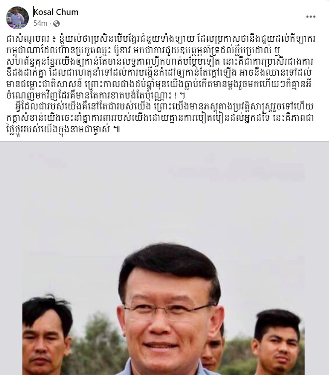 ក្នុងនោះរដ្ឋលេខាធិការក្រសួងព័ត៌មានរូបនេះ ក៏បានលើកឡើងថាបើបង្វែរជំនួយ មកជាការជួយឧបត្ថម្ភ ក្លឹប ឬសហព័ន្ធគុនខ្មែរ កាន់តែមានលទ្ធភាពហ្វឹកហាត់បន្ថែមទៀតនោះគឺជាការប្រសើរជាងការឌឺដងដាក់គ្នា។ ឯកឧត្តម បានបង្ហោះសារនៅលើគណនីហ្វេសប៊ុកយ៉ាងដូច្នេះថា៖ «ជាសំណូមពរ ៖ ខ្ញុំយល់ថាប្រសិនបើបង្វែរជំនួយទាំងឡាយ ដែលប្រកាសថានឹងជួយដល់កីឡាករកម្ពុជាណាដែលហ៊ានប្រកួតឈ្នះ ប៊ូខាវ មកជាការជួយឧបត្ថម្ភគាំទ្រដល់ក្លឹបប្រដាល់ ឬ សហព័ន្ធគុនខ្មែរយើងឱ្យកាន់តែមានលទ្ធភាពហ្វឹកហាត់បន្ថែមទៀតនោះគឺជាការប្រសើរជាងការឌឺដងដាក់គ្នា ដែលជាហេតុនាំទៅដល់ការបង្កើនកំដៅឲ្យកាន់តែក្តៅឡើង អាចនឹងឈានទៅដល់មានជម្លោះជាតិសាសន៍ ព្រោះកាលជាងដប់ឆ្នាំមុនយើងធ្លាប់កើតមានម្តងរួចមកហើយៗក៏គ្មានអីចំណេញមកវិញដែរគឺមានតែការខាតបង់តែប៉ុណ្ណោះ។ អ្វីដែលជារបស់យើងគឺនៅតែជារបស់យើង ព្រោះយើងមានភស្តុតាងប្រវត្តិសាស្ត្ររួចទៅហើយ កត្តាសំខាន់យើងចេះនាំគ្នាការពាររបស់យើងដោយគ្មានការបៀតបៀនដល់អ្នកដទៃ នេះគឺភាពជាថ្លៃថ្នូររបស់យើងក្នុងនាមជាម្ចាស់»។
