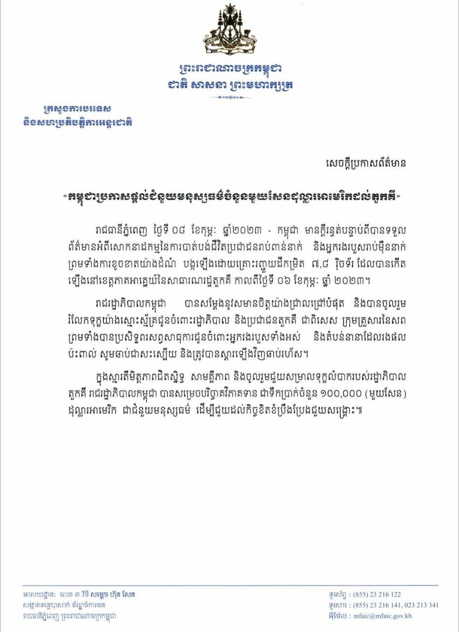 រាជរដ្ឋាភិបាលកម្ពុជា បានសម្តែងនូវសមានចិត្តយ៉ាងជ្រាលជ្រៅបំផុត និងបានចូលរួម រំលែកទុក្ខយ៉ាងស្មោះស្ម័គ្រជូនចំពោះរដ្ឋាភិបាល និងប្រជាជនតួកគី ជាពិសេស ក្រុមគ្រួសារនៃសព ព្រមទាំងបានប្រសិទ្ឋពរសព្វសាធុការជូនចំពោះអ្នករងរបួសទាំងអស់ និងតំបន់នានាដែលរងផល ប៉ះពាល់ សូមឆាប់ជាសះស្បើយ និងត្រូវបានស្ដារឡើងវិញឆាប់រហ័ស។ ក្នុងស្មារតីមិត្តភាពជិតស្និទ្ធ សាមគ្គីភាព និងចូលរួមជួយសម្រាលទុក្ខលំបាករបស់រដ្ឋាភិបាល តួកគី រាជរដ្ឋាភិបាលកម្ពុជា បានសម្រេចបរិច្ចាគវិភាគទាន ជាទឹកប្រាក់ចំនួន ១០០,០០០ (មួយសែន) ដុល្លារអាមេរិក ជាជំនួយមនុស្សធម៌ ដើម្បីជួយដល់កិច្ចខិតខំប្រឹងប្រែងជួយសង្គ្រោះ៕