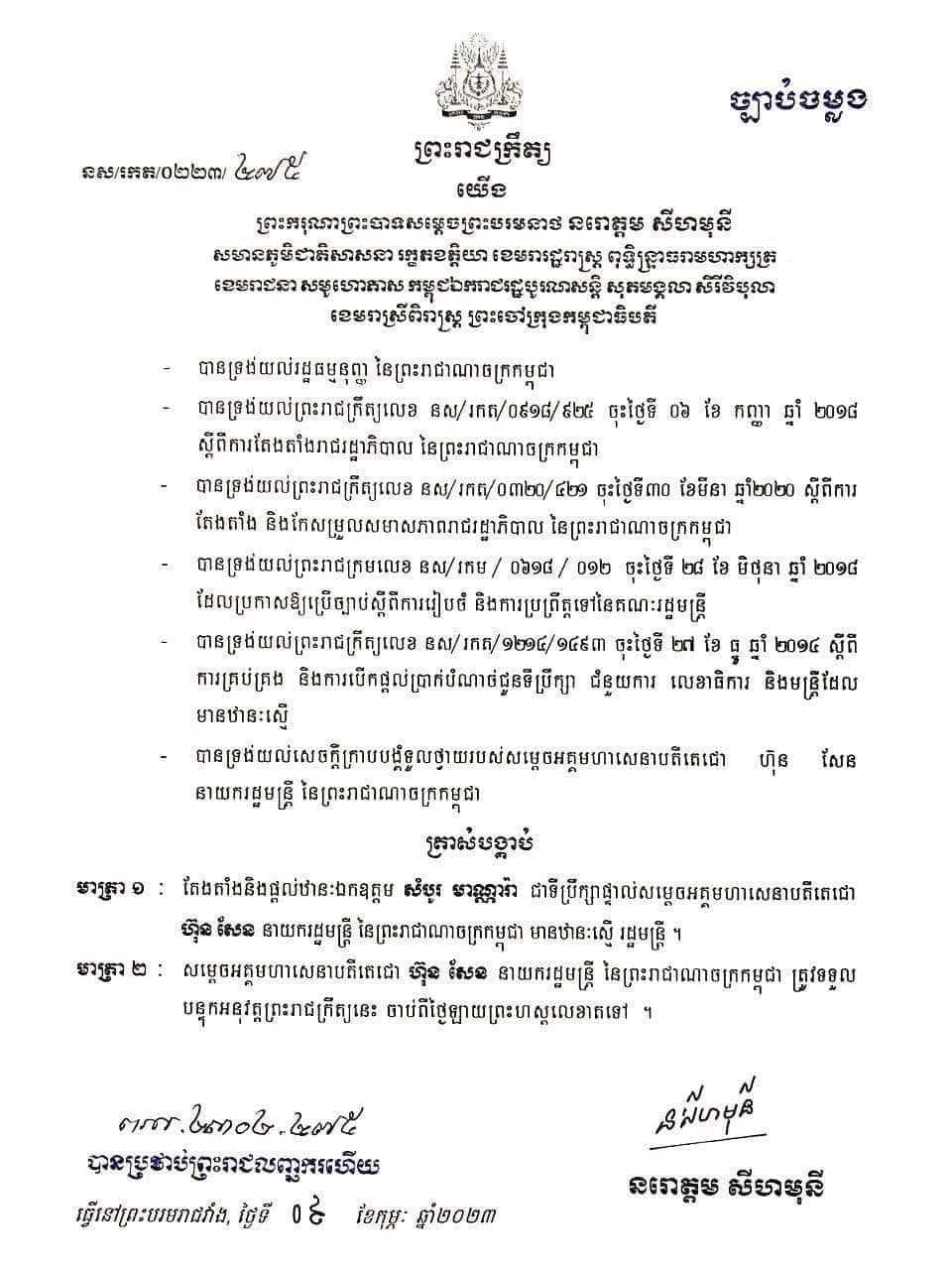 (ភ្នំពេញ)៖ ព្រះករុណា ព្រះបាទ សម្តេចព្រះ បរមនាថ នរោត្តម សីហមុនី ព្រះមហាក្សត្រនៃកម្ពុជា បានចេញព្រះរាជក្រឹត្យ ត្រាស់បង្គាប់តែងតាំង និងផ្តល់ឋានៈដល់លោក សំបូរ មាណ្ណារ៉ា ជាទីប្រឹក្សាផ្ទាល់សម្ដេចតេជោ ហ៊ុន សែន នាយករដ្ឋមន្ដ្រីនៃកម្ពុជា មានឋានៈស្មើរដ្ឋមន្ដ្រី។ ការតែងតាំងនេះគឺតាមរយៈព្រះរាជក្រឹត្យដែលព្រះមហាក្សត្រទ្រង់ឡាយព្រះហស្ថលេខា នៅថ្ងៃទី០៩ ខែកុម្ភៈ ឆ្នាំ២០២៣។ ខាងក្រោមនេះជាព្រះរាជក្រឹត្យរបស់ព្រះមហាក្សត្រ៖