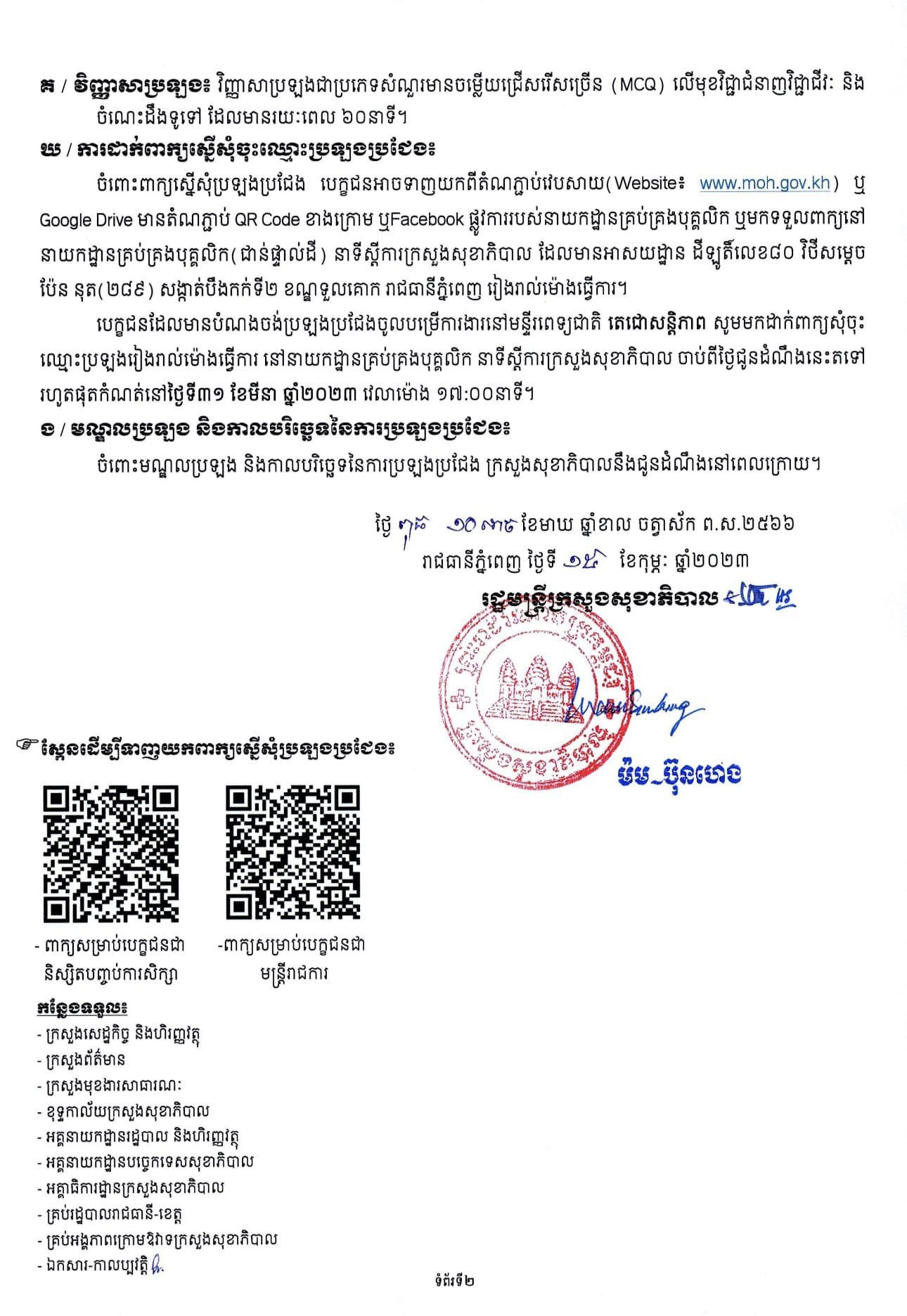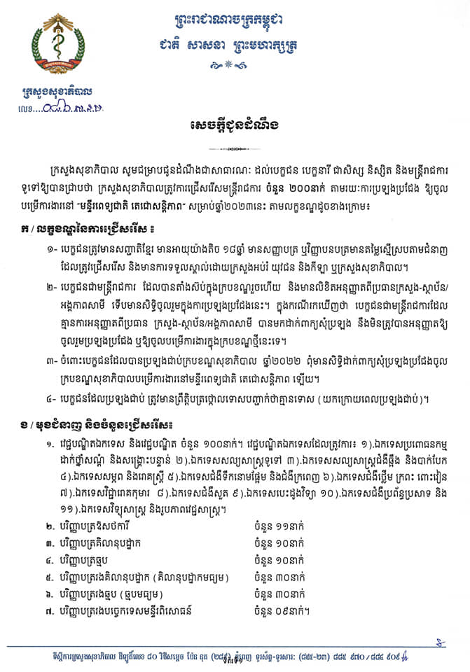 ក្រសួងសុខាភិបាល ជូនដំណឹងពីការប្រឡងជ្រើសរើសមន្ត្រីរាជការចំនួន ២០០នាក់ ចូលបម្រើការងារនៅមន្ទីរពេទ្យជាតិតេជោសន្តិភាព