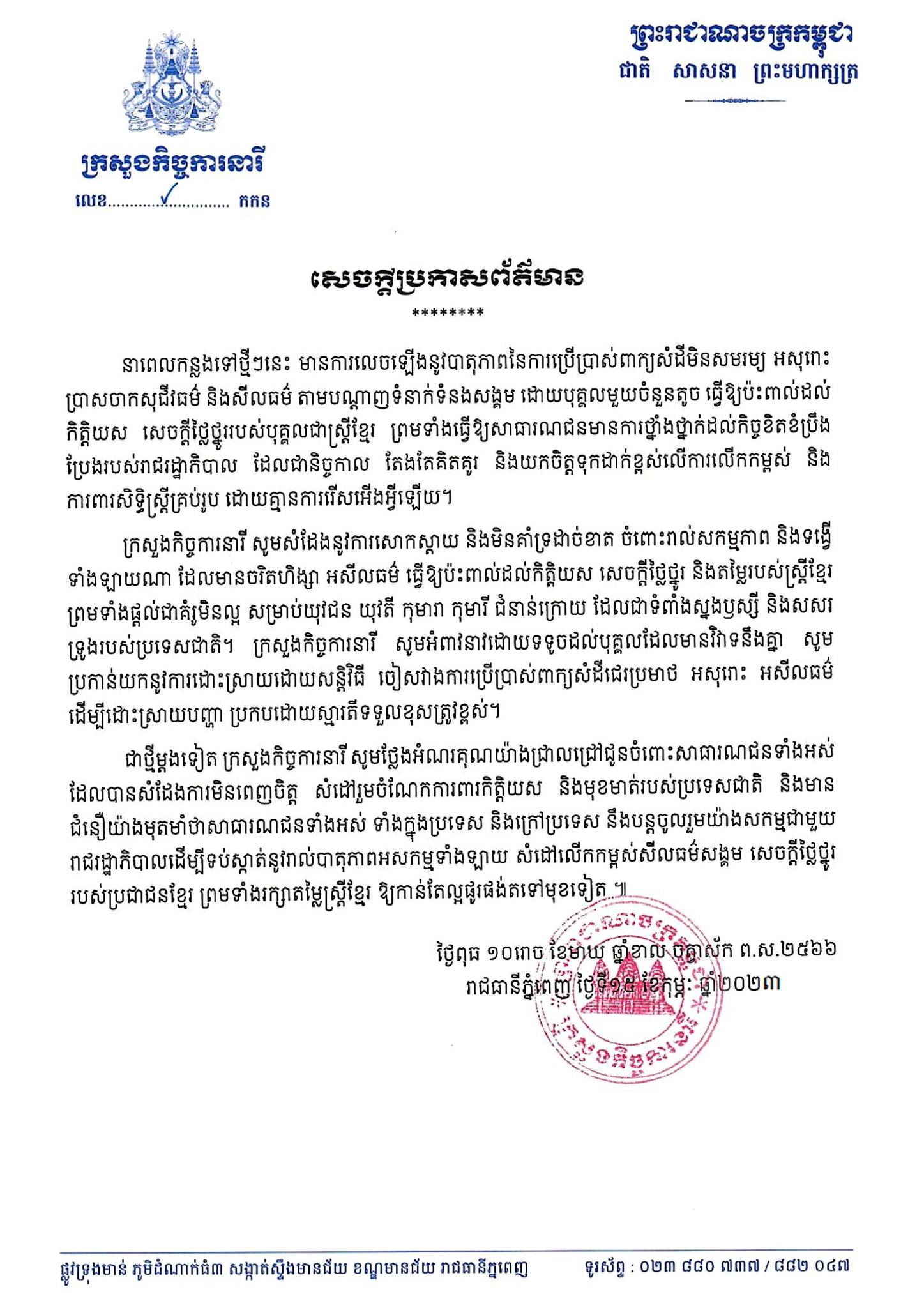 នាពេលកន្លងទៅថ្មីៗនេះ មានការលេចឡើងនូវបាតុភាពនៃការប្រើប្រាស់ពាក្យសំដីមិនសមរម្យ អសុរោះ ប្រាសចាកសុជីវធម៌ និងសីលធម៌ តាមបណ្ដាញទំនាក់ទំនងសង្គម ដោយបុគ្គលមួយចំនួនតូច ធ្វើឱ្យប៉ះពាល់ដល់ កិត្តិយស សេចក្ដីថ្លៃថ្នូររបស់បុគ្គលជាស្ត្រីខ្មែរ ព្រមទាំងធ្វើឱ្យសាធារណជនមានការថ្នាំងថ្នាក់ដល់កិច្ចខិតខំប្រឹង ប្រែងរបស់រាជរដ្ឋាភិបាល ដែលជានិច្ចកាល តែងតែគិតគូរ និងយកចិត្តទុកដាក់ខ្ពស់លើការលើកកម្ពស់ និង ការពារសិទ្ធិស្ត្រីគ្រប់រូប ដោយគ្មានការរើសអើងអ្វីឡើយ។
