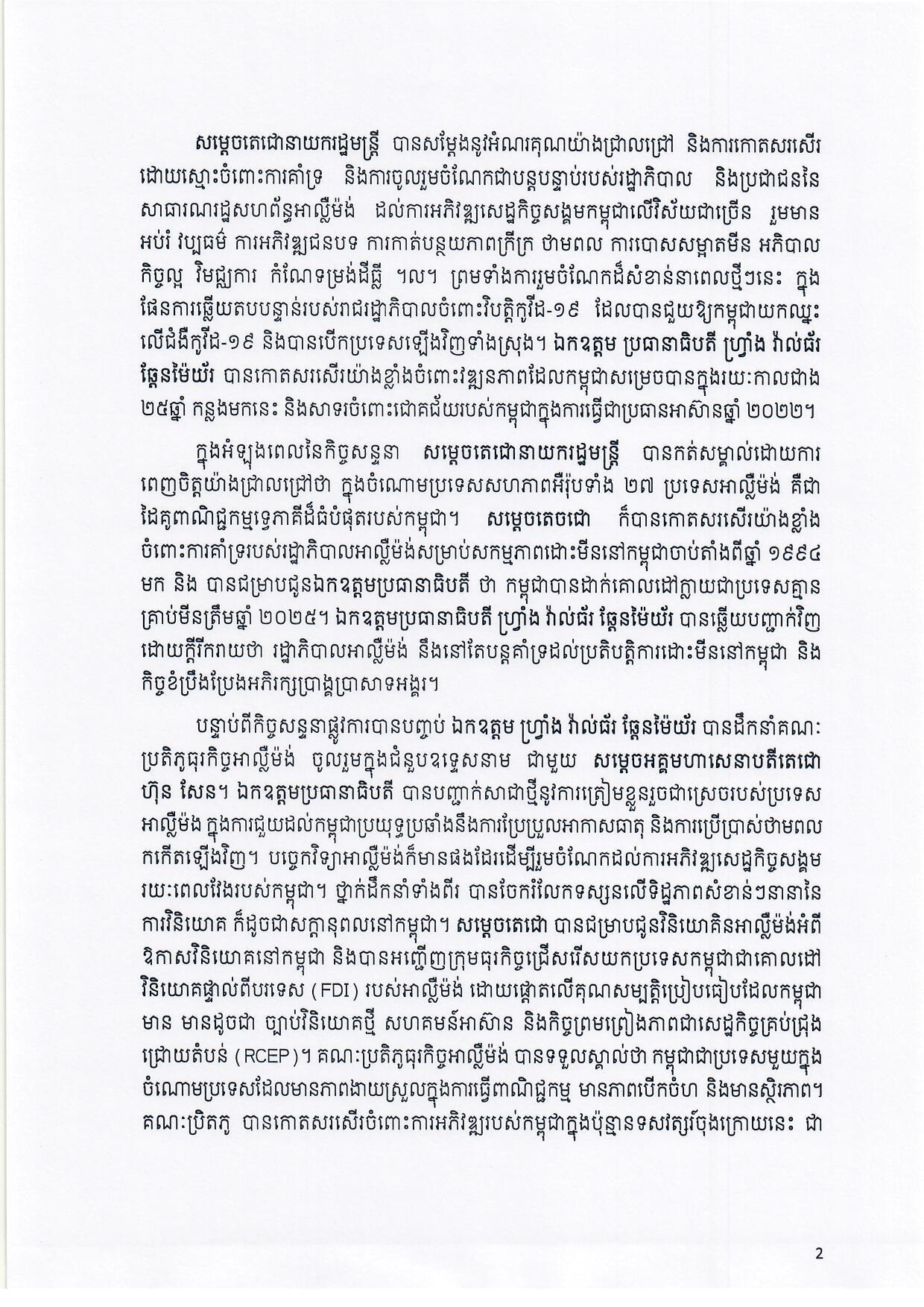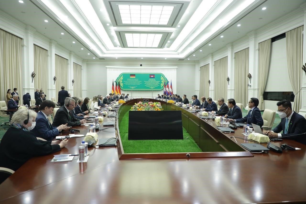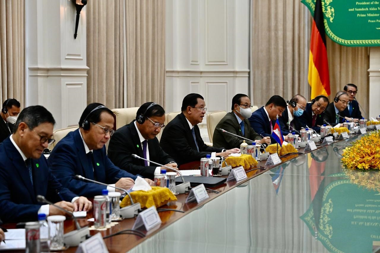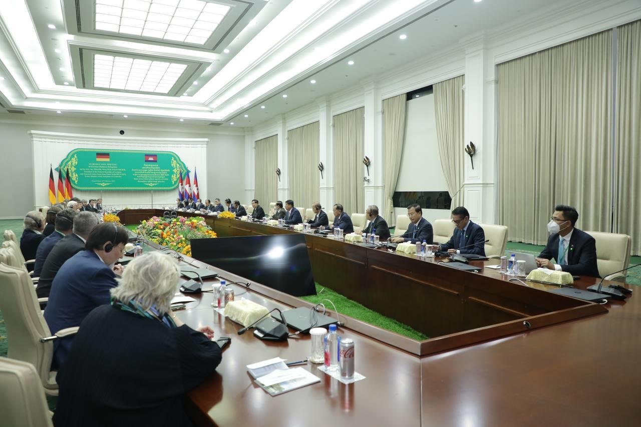 ក្រសួងការបរទេស បានបញ្ជាក់ថា នៅក្នុងកិច្ចពិភាក្សានេះ សម្ដេចតេជោនាយករដ្ឋមន្ត្រី បានសម្ដែងនូវអំណរគុណយ៉ាងជ្រាលជ្រៅ និងការកោតសរសើរដោយស្មោះចំពោះការគាំទ្រ និងការចូលរួមចំណែកជាបន្តបន្ទាប់របស់រដ្ឋាភិបាល និងប្រជាជននៃសាធារណរដ្ឋសហព័ន្ធអាល្លឺម៉ង់ ដល់ការអភិវឌ្ឍសេដ្ឋកិច្ចសង្គមកម្ពុជាលើវិស័យជាច្រើន រួមមាន អប់រំ វប្បធម៌ ការអភិវឌ្ឍជនបទ ការកាត់បន្ថយភាពក្រីក្រ ថាមពល ការបោសសម្អាតមីន អភិបាលកិច្ចល្អ វិមជ្ឈការ កំណែទម្រង់ដីធ្លី ។ល។ ព្រមទាំងការរួមចំណែកដ៏សំខាន់នាពេលថ្មីៗនេះ ក្នុងផែនការឆ្លើយតបបន្ទាន់របស់រាជរដ្ឋាភិបាលចំពោះវិបត្តិកូវីដ-១៩ ដែលបានជួយឱ្យកម្ពុជាយកឈ្នះលើជំងឺកូវីដ-១៩ និងបានបើកប្រទេសឡើងវិញទាំងស្រុង។