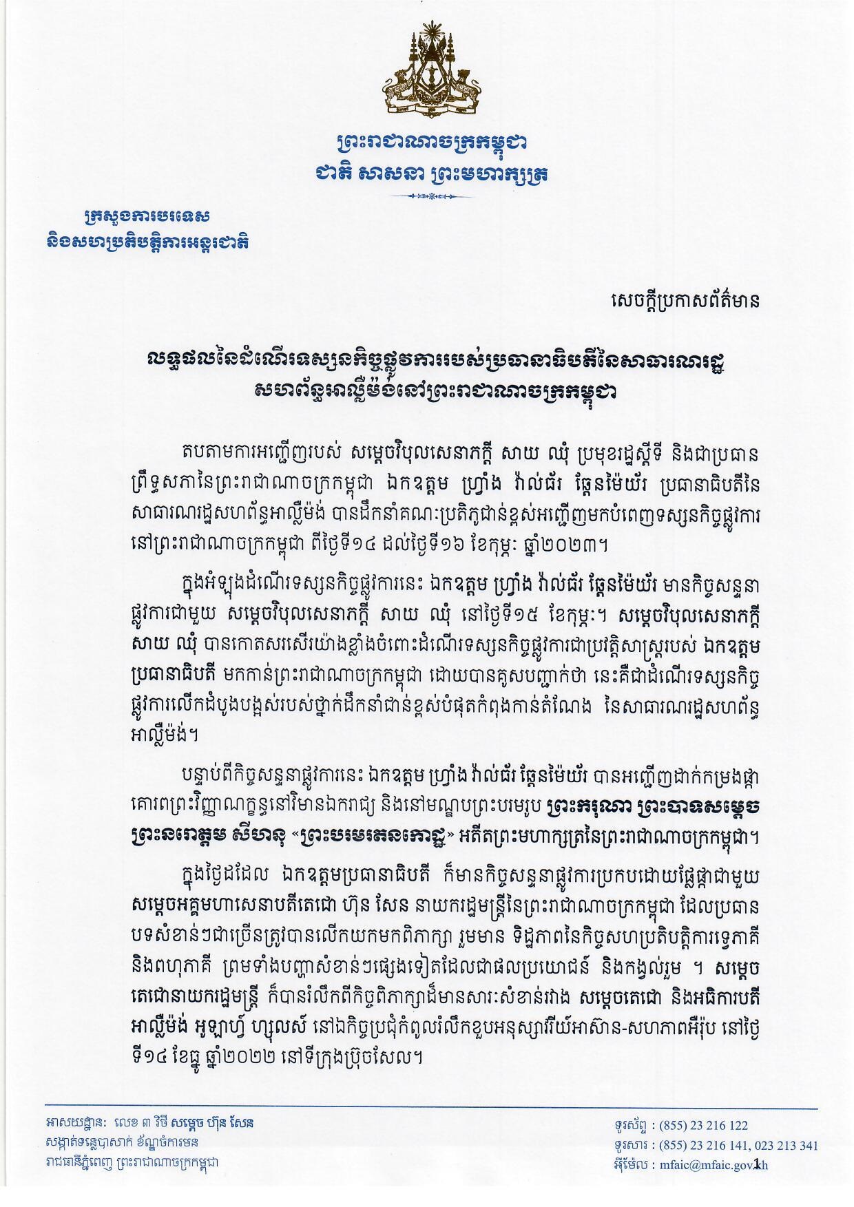 ការអះអាងនេះ បានធ្វើឡើងក្នុងឱកាសដែលលោក ជួបពិភាក្សាការងារជាមួយ សម្តេចតេជោ ហ៊ុន សែន នាយករដ្ឋមន្ត្រីនៃកម្ពុជា ហើយត្រូវបានបញ្ជាក់នៅក្នុងសេចក្តីប្រកាសរបស់ក្រសួងការបរទេស នៅថ្ងៃទី១៦ ខែកុម្ភៈ ឆ្នាំ២០២៣។