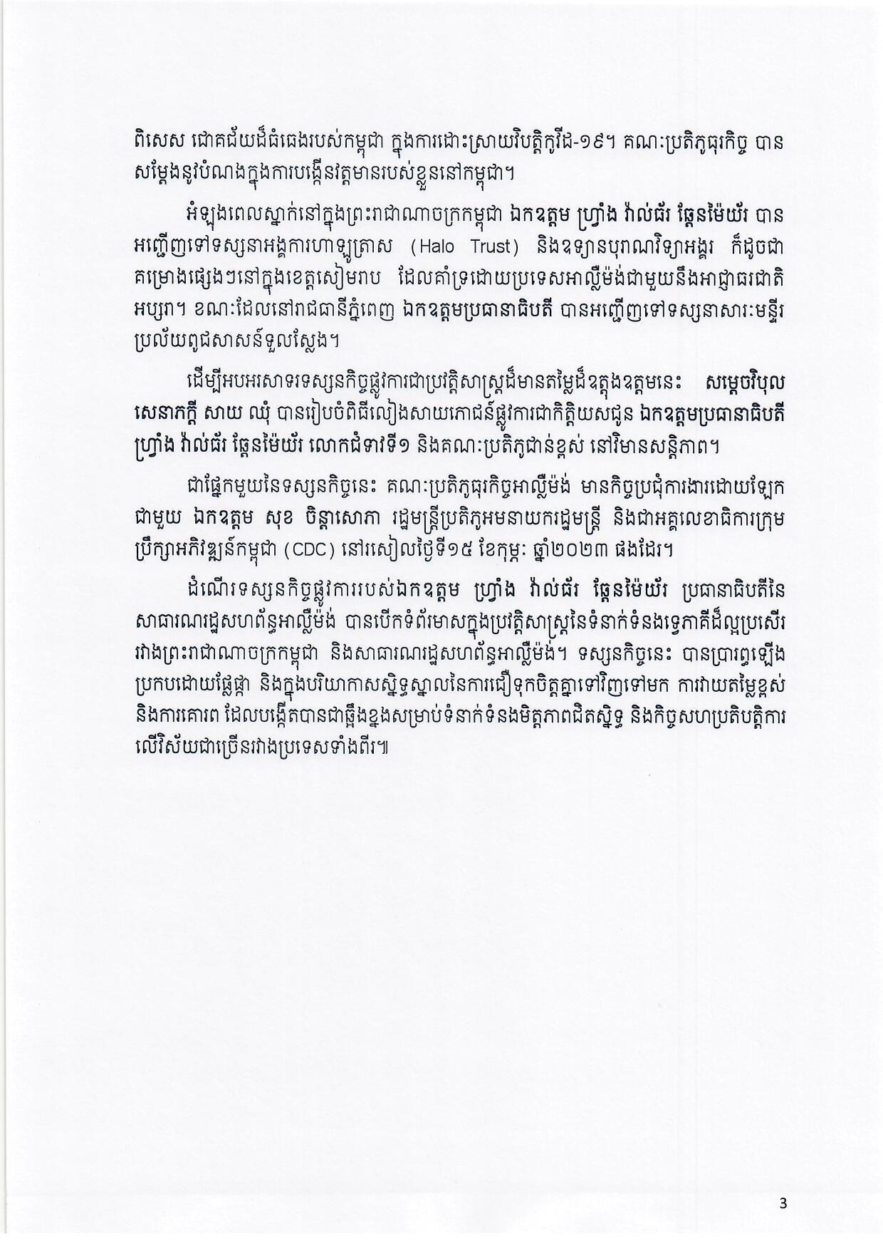 «ក្នុងអំឡុងពេលនៃកិច្ចសន្ទនា សម្ដេចតេជោនាយករដ្ឋមន្ត្រី បានកត់សម្គាល់ដោយការពេញចិត្តយ៉ាងជ្រាលជ្រៅថា ក្នុងចំណោមប្រទេសសហភាពអឺរ៉ុបទាំង ២៧ ប្រទេសអាល្លឺម៉ង់ គឺជាដៃគូពាណិជ្ជកម្មទ្វេភាគីដ៏ធំបំផុតរបស់កម្ពុជា។ សម្ដេចតេចជោ ក៏បានកោតសរសើរយ៉ាងខ្លាំងចំពោះការគាំទ្ររបស់រដ្ឋាភិបាលអាល្លឺម៉ង់សម្រាប់សកម្មភាពដោះមីននៅកម្ពុជាចាប់តាំងពីឆ្នាំ ១៩៩៤ មក និង បានជម្រាបជូនឯកឧត្តមប្រធានាធិបតី ថា កម្ពុជាបានដាក់គោលដៅក្លាយជាប្រទេសគ្មានគ្រាប់មីនត្រឹមឆ្នាំ ២០២៥។ ឯកឧត្តមប្រធានាធិបតី ហ្រ្វាំង វ៉ាល់ធ័រ ឆ្តែនម៉ៃយ័រ បានឆ្លើយបញ្ជាក់វិញដោយក្តីរីករាយថា រដ្ឋាភិបាលអាល្លឺម៉ង់ នឹងនៅតែបន្តគាំទ្រដល់ប្រតិបត្តិការដោះមីននៅកម្ពុជា និងកិច្ចខំប្រឹងប្រែងអភិរក្សប្រាង្គប្រាសាទអង្គរ»។ នេះបើតាម ការបញ្ជាក់នៅក្នុងសេចក្តីប្រកាសរបស់ក្រសួងការបរទេស។