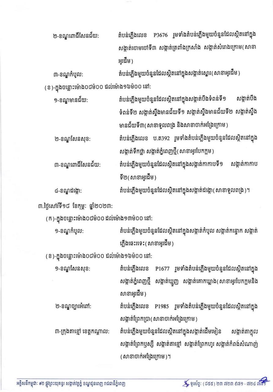 EDC ជូនដំណឹងពីការរអាក់រអួលចរន្ត ចាប់ពីថ្ងៃនេះដល់ថ្ងៃទី១៩ ខែកុម្ភៈ ដើម្បីរុះរើគន្លង ខ្សែបណ្តាញ ផ្លាស់ប្តូរ តម្លើងបរិក្ខារ ងាយស្រួលដល់ការដ្ឋានពង្រីកផ្លូវ