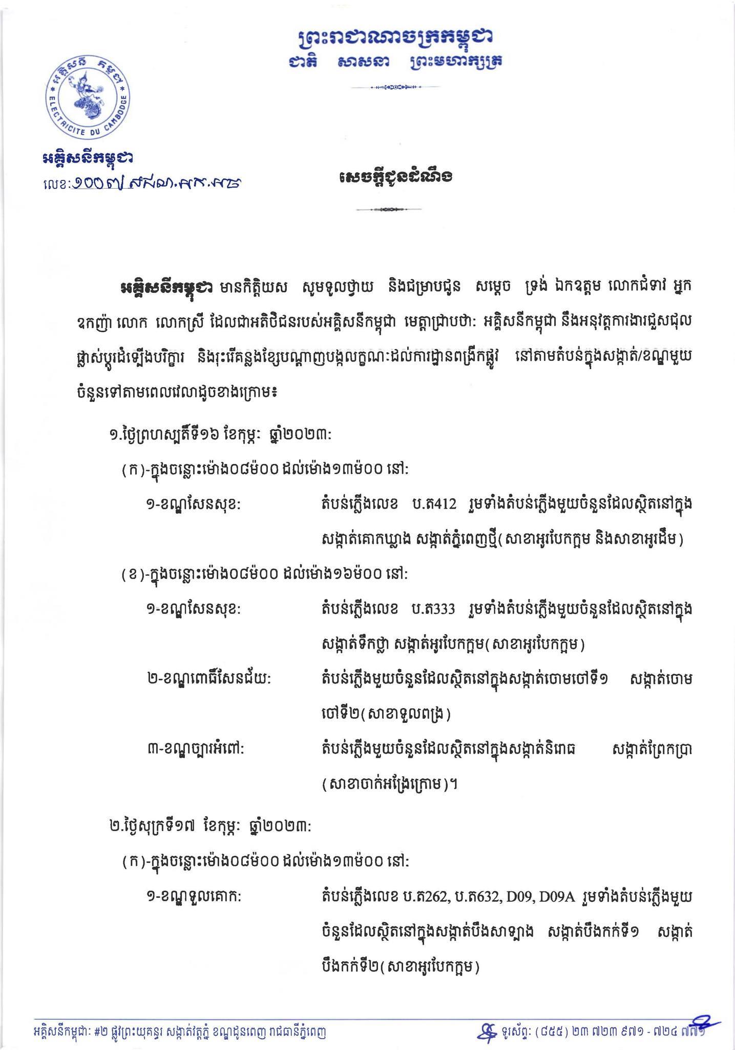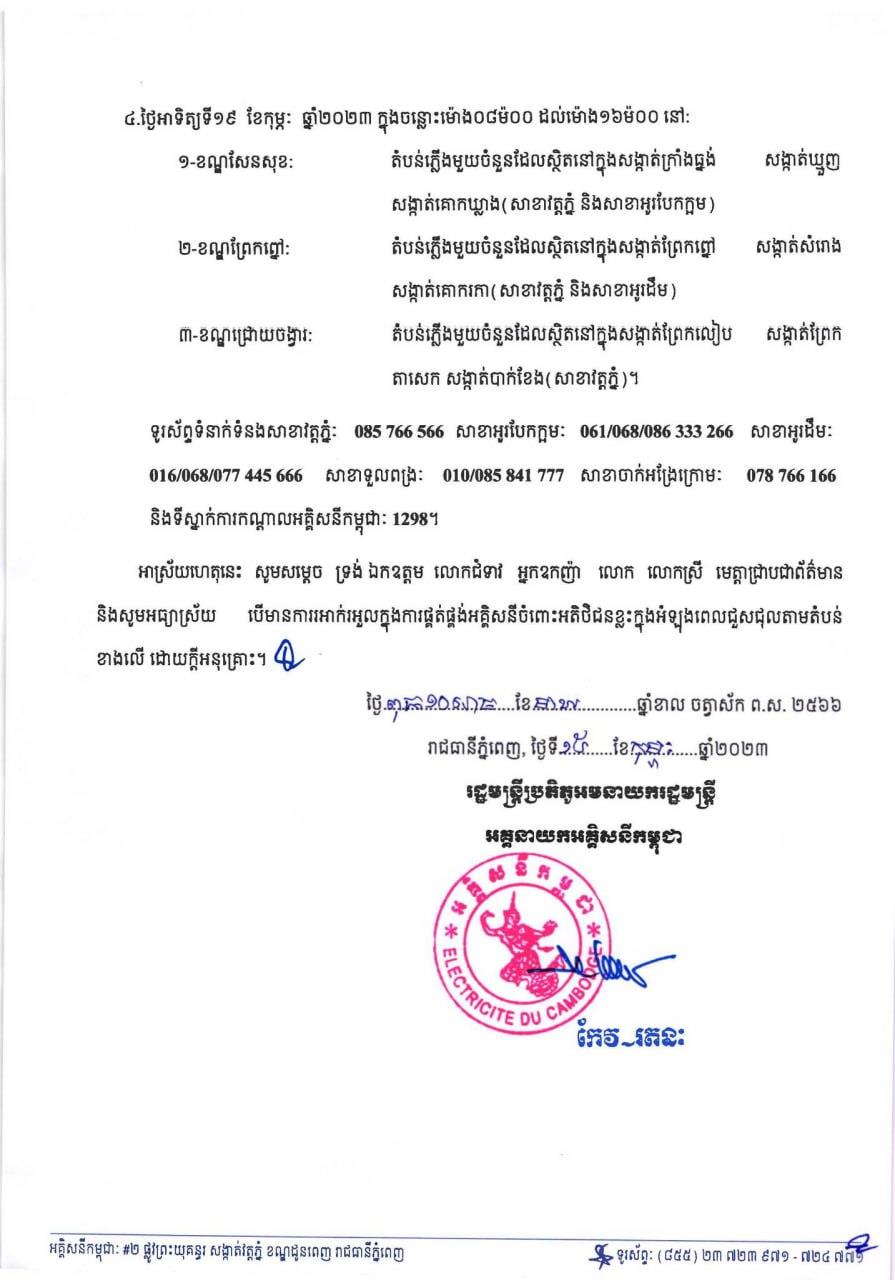 សូមអានសេចក្តីជូនដំណឹង របស់អគ្គិសនីកម្ពុជា ដូចខាងក្រោម៖