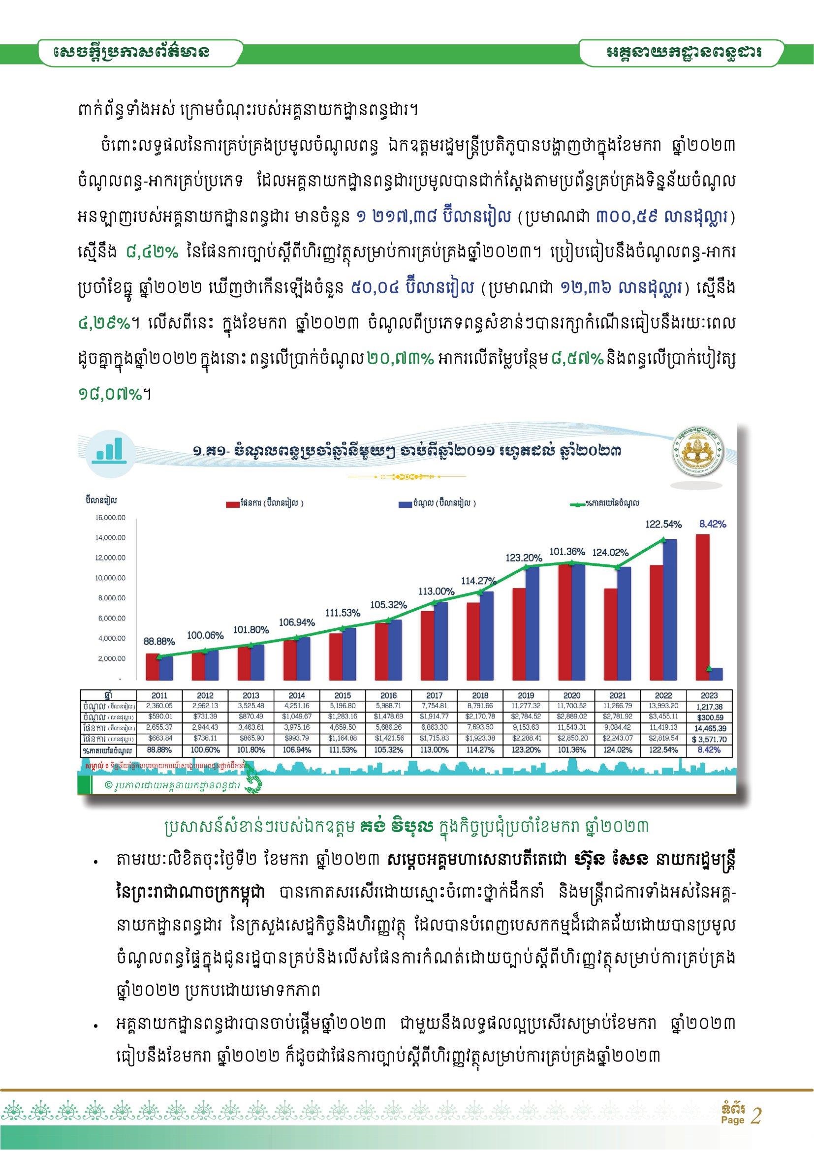 ការបង្ហាញតួលេខចំណូលពន្ធរបស់លោក គង់ វិបុល នេះ ធ្វើឡើងក្នុងកិច្ចប្រជុំបូកសរុបលទ្ធផលប្រមូលចំណូលពន្ធប្រចាំខែមករា ឆ្នាំ២០២៣
