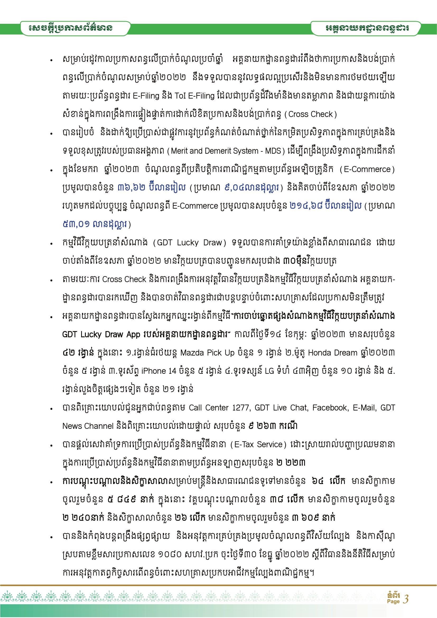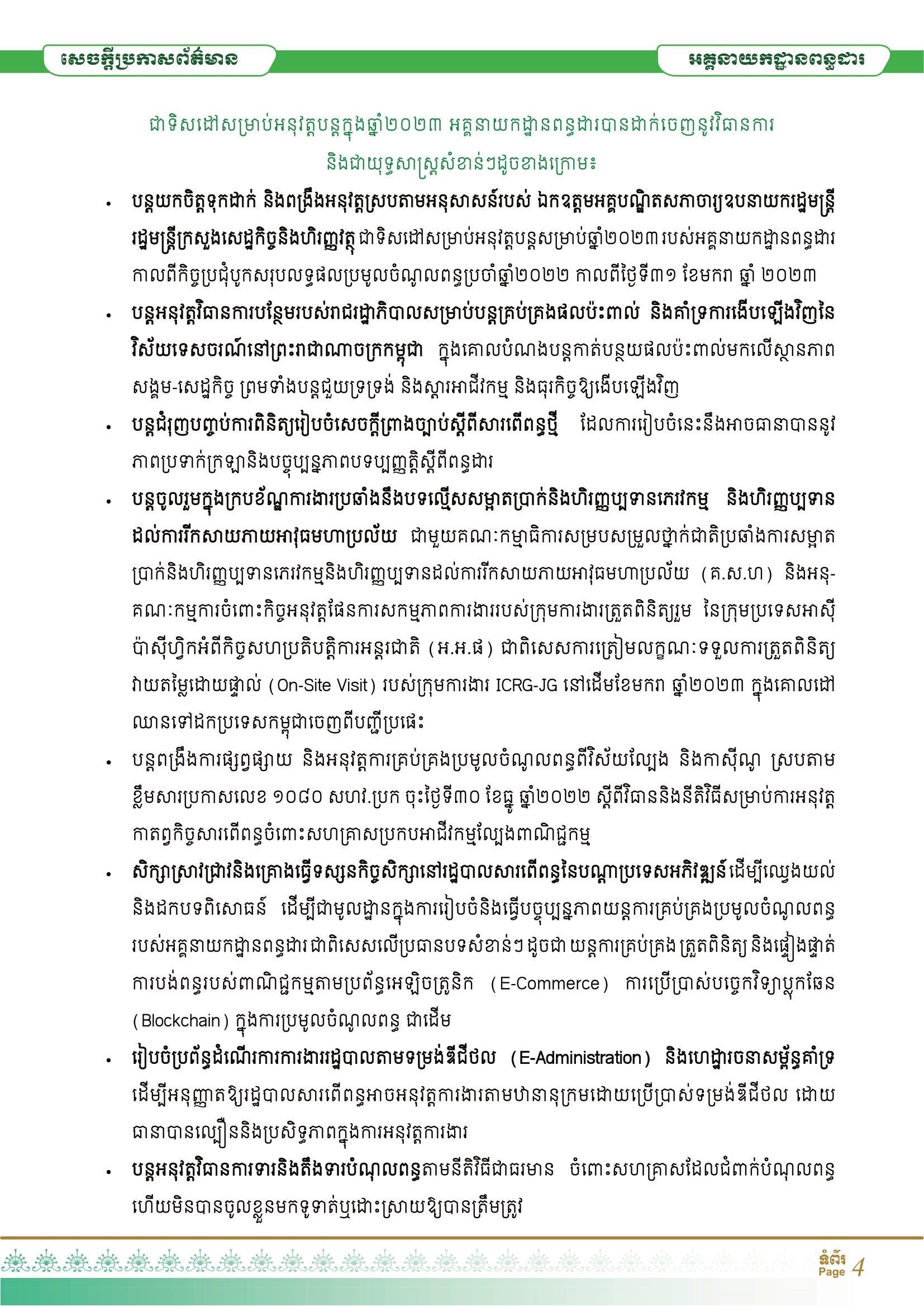 ព្រមទាំងទិសដៅសម្រាប់អនុវត្តបន្ត របស់អគ្គនាយកដ្ឋានពន្ធដារ នៅថ្ងៃទី១៦ ខែមករា ឆ្នាំ២០២៣។