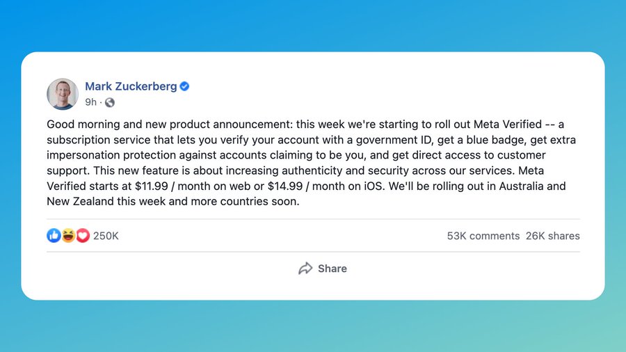 Mark Zuckerberg ប្រកាសថា Facebook និង Instagram នឹងមានសេវាកម្មលក់ Blue Tick តម្លៃចាប់ពី ១១.៩៩ដុល្លារ