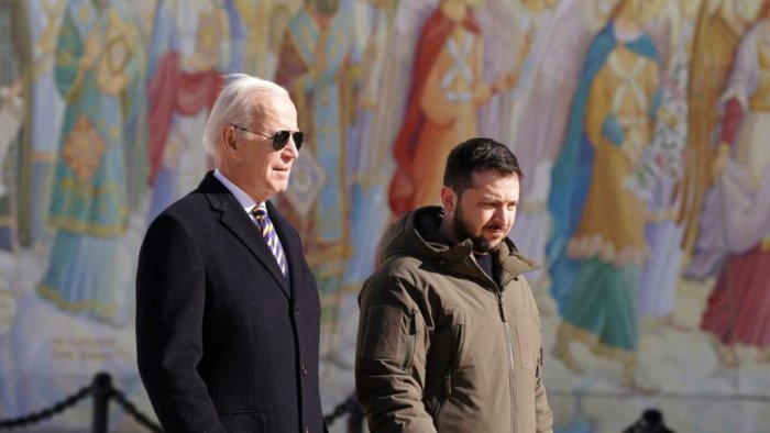 នៅទីក្រុងកៀវ លោក បៃដិន បានជួបគ្នាជាមួយប្រធានាធិបតីអ៊ុយក្រែន លោក វ៉ូឡូឌីមៀ ហ្សេលេនស្គី។ លោក ហ្សេលេនស្គី បានបង្ហោះរូបថតអ្នកទាំងពីរចាប់ដៃគ្នា ជាមួយខ្លឹមសារយ៉ាងដូច្នេះថា «ដំណើរទស្សនកិច្ចរបស់អ្នជាសញ្ញាដ៏សំខាន់បំផុត បង្ហាញពីការគាំទ្រសម្រាប់ប្រជាជនអ៊ុយក្រែន»។ វាគឺជាទស្សនកិច្ចលើកដំបូង របស់លោក បៃដិន មកកាន់ទីក្រុងកៀវ គិតចាប់តាំងពីសង្រ្គាមផ្ទុះឡើង។ កាលពីខែធ្នូ ឆ្នាំ២០២២ លោក ហ្សេលេនស្គី បានបំពេញទស្សនកិច្ចចេញប្រទេសជាលើកដំបូង កំលុងពេលមានសង្រ្គាម ទៅកាន់រដ្ឋធានីវ៉ាស៉ីនតោនរបស់សហរដ្ឋអាមេរិក។