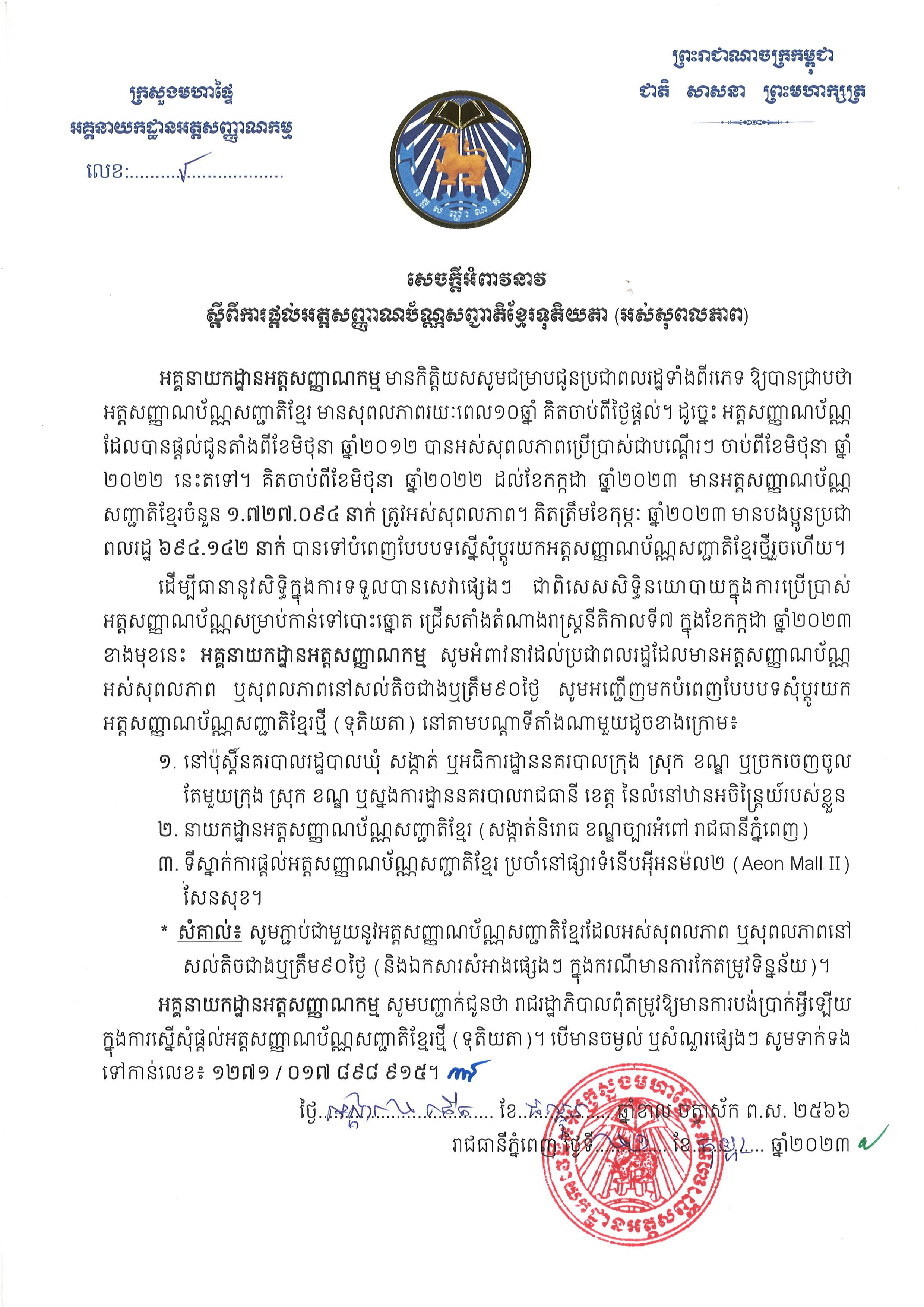 សេចក្តីអំពាវនាវបានលើកឡើងថា «ដើម្បីធានានូវសិទ្ធិក្នុងការទទួលបានសេវាផ្សេងៗ ជាពិសេសសិទ្ធិនយោបាយក្នុងការប្រើប្រាស់ អត្តសញ្ញាណប័ណ្ណសម្រាប់កាន់ទៅបោះឆ្នោត ជ្រើសតាំងតំណាងរាស្ត្រនីតិកាលទី៧ ក្នុងខែកក្កដា ឆ្នាំ២០២៣ខាងមុខនេះ អគ្គនាយកដ្ឋានអត្តសញ្ញាណកម្ម សូមអំពាវនាវដល់ប្រជាពលរដ្ឋ ដែលមានអត្តសញ្ញាណប័ណ្ណ អស់សុពលភាព ឬសុពលភាពនៅសល់តិចជាង ឬត្រឹម៩០ថ្ងៃ សូមអញ្ជើញមកបំពេញបែបបទសុំប្ដូរយកអត្តសញ្ញាណប័ណ្ណសញ្ជាតិខ្មែរថ្មី (ទុតិយតា)»។