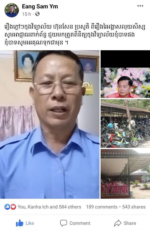 ក្នុងនាមជាអាណាព្យាបាល ក៏ដូចជាគ្រូបង្រៀនម្នាក់ក្នុងវិទ្យាល័យប្រសូតិ លោកគ្រូ អុីម សំណូមពរអភិបាលខេត្តស្វាយរៀង និងមន្ទីរអប់រំ សូមមេត្តាមកពិនិត្យមើលការដឹកនាំរបស់លោក ចាន់ គឹមសែន ជានាយកវិទ្យាល័យហ៊ុនសែន ប្រសូតិ ដែលមានការរៃអអង្គាសប្រាក់ពីសិស្សចំនួន១០ដុល្លារ។