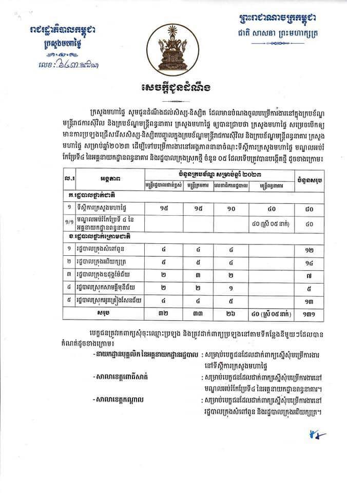 (ភ្នំពេញ)៖ ក្រសួងមហាផ្ទៃ បានសម្រេចបើកឲ្យមានការប្រឡងជ្រើសរើសសិស្ស-និស្សិត បញ្ចូលក្នុងក្របខ័ណ្ឌមន្រ្តីរាជការស៉ីវិល និងក្របខ័ណ្ឌមន្រ្តីពន្ធនាគារ ក្រសួងមហាផៃ្ទ សម្រាប់ឆ្នំា២០២៣ ដើម្បីទៅបម្រើការងារនៅអង្គភាពនានា ចំណុះទីស្តីការក្រសួងមហាផ្ទៃ មណ្ឌលអប់រំកែប្រែទី៤ នៃអគ្គនាយកដ្ឋានពន្ធនាគារ និងរដ្ឋបាលក្រុងស្រុកថ្មី ចំនួន៥ ដែលទើបត្រូវបានបង្កើតថ្មី។ នេះបើតាម សេចក្តីជូនដំណឹងដែលបណ្តាញ Fresh News ទទួលបាននៅថ្ងៃទី១០ ខែមីនា ឆ្នាំ២០២៣៕