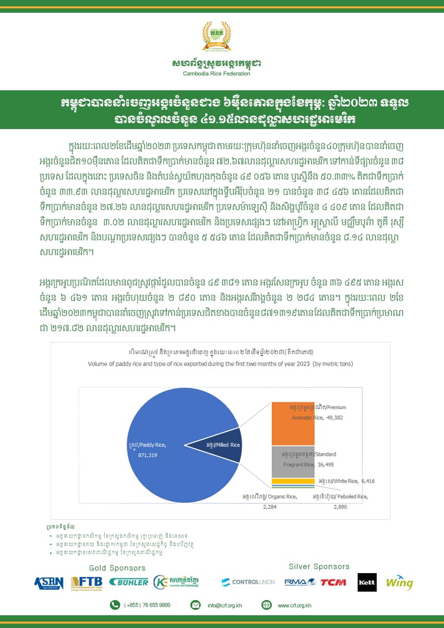 (ភ្នំពេញ)៖ ក្នុងរយៈពេល ២ខែដើមឆ្នាំ២០២៣ កម្ពុជាបាននាំចេញអង្ករចំនួនជិត ១០ម៉ឺនតោន ទៅកាន់ទីផ្សារចំនួន ៣៨ប្រទេស ដោយទទួលបានទឹកប្រាក់ចំនួន ៧២.៦៧លានដុល្លារសហរដ្ឋអាមេរិក ។ នេះបើយោងតាមសេចក្តីប្រកាសព័ត៌មាន របស់សហព័ន្ធស្រូវអង្ករ ដែលបណ្តាញព័ត៌មាន Fresh News ទទួលបាននៅថ្ងៃទី១០ ខែមីនា ឆ្នាំ២០២៣នេះ។