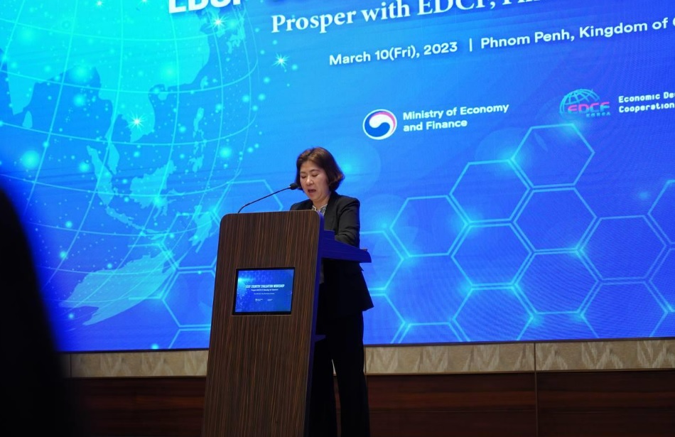 ថ្លែងក្នុងសិក្ខាសាលាស្តីអំពីការវាយតម្លៃប្រចាំប្រទេសលើកទី១ របស់មូលនិធិសហប្រតិបត្តិការអភិវឌ្ឍន៍សេដ្ឋកិច្ច (EDCF) ដែលបានធ្វើឡើងរួមគ្នារវាងក្រសួងសេដ្ឋកិច្ច និងហិរញ្ញវត្ថុ និងធនាគារនីហរ័ណ-អាហរ័ណនៃប្រទេសកូរ៉េ លោកស្រី គីម ឃ្យុងហ៉ី បានកត់សម្គាល់ថា កម្ពុជា គឺជាប្រទេសដៃគូធំទី២ របស់ EDCF។