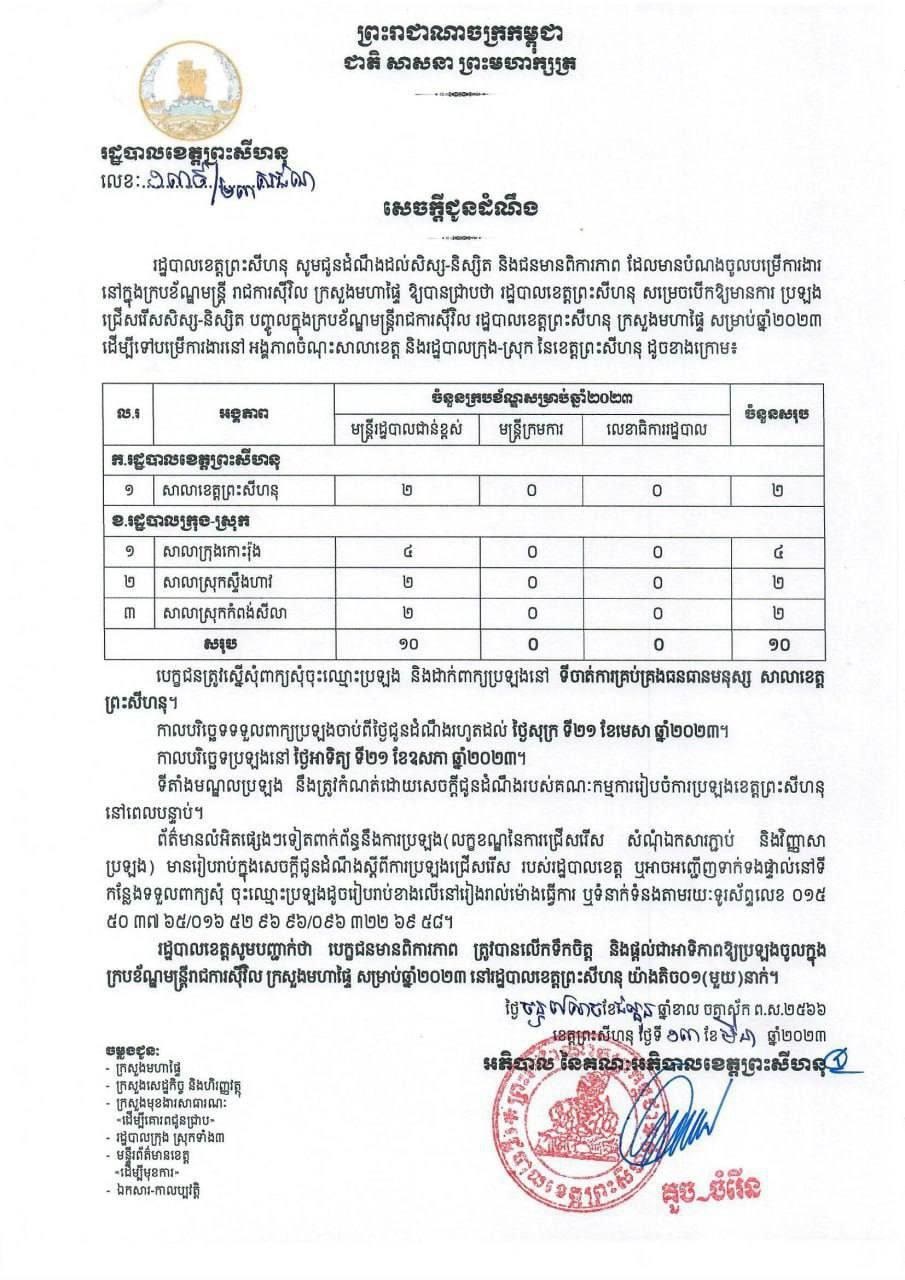(ព្រះសីហនុ)៖ រដ្ឋបាលខេត្តព្រះសីហនុ សេចក្តីជូនដំណឹងដល់សិស្ស-និស្សិត និងជនមានពិការភាព ដែលមានបំណងចូលបម្រើការងារ នៅក្នុងក្របខ័ណ្ឌមន្ត្រី រាជការស៊ីវិល ក្រសួងមហាផ្ទៃ ឱ្យបានជ្រាបថា រដ្ឋបាលខេត្តព្រះសីហនុ សម្រេចបើកឱ្យមានការប្រឡង ជ្រើសរើសសិស្ស-និស្សិត បញ្ចូលក្នុងក្របខ័ណ្ឌមន្ត្រីរាជការស៊ីវិល រដ្ឋបាលខេត្តព្រះសីហនុ សម្រាប់ឆ្នាំ២០២៣ ដើម្បីទៅបម្រើការងារនៅ អង្គភាពចំណុះសាលាខេត្ត និងរដ្ឋបាលក្រុង-ស្រុក នៃខេត្តព្រះសីហនុ។