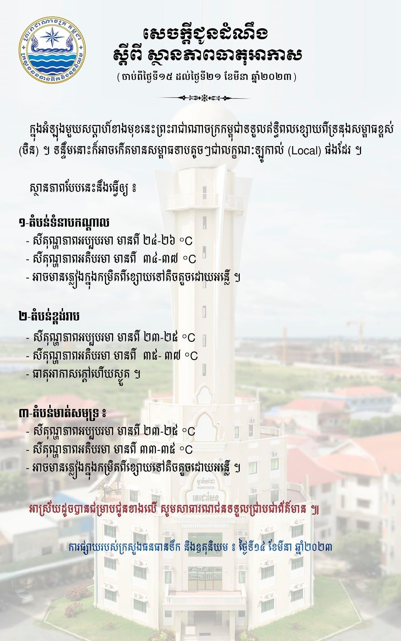 (ភ្នំពេញ)៖ ក្រសួងធនធានទឹក និងឧតុនិយម នៅថ្ងៃទី១៤ ខែមីនា ឆ្នាំ២០២៣នេះ បានចេញសេចក្តីជូនដំណឹង ស្ដីពី ស្ថានភាពធាតុអាកាស នៅកម្ពុជាចាប់ពីថ្ងៃទី១៥ ដល់ថ្ងៃទី២១ ខែមីនា ឆ្នាំ២០២៣។