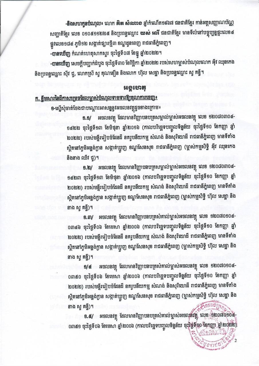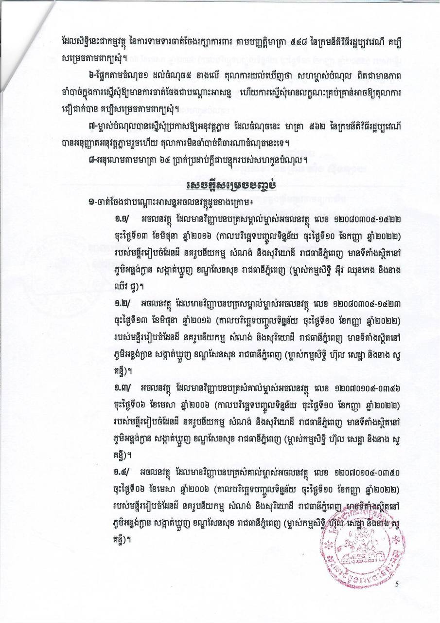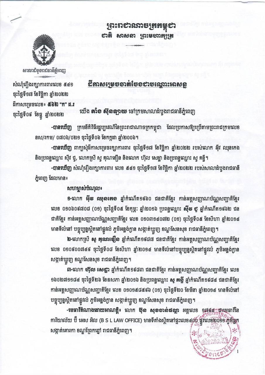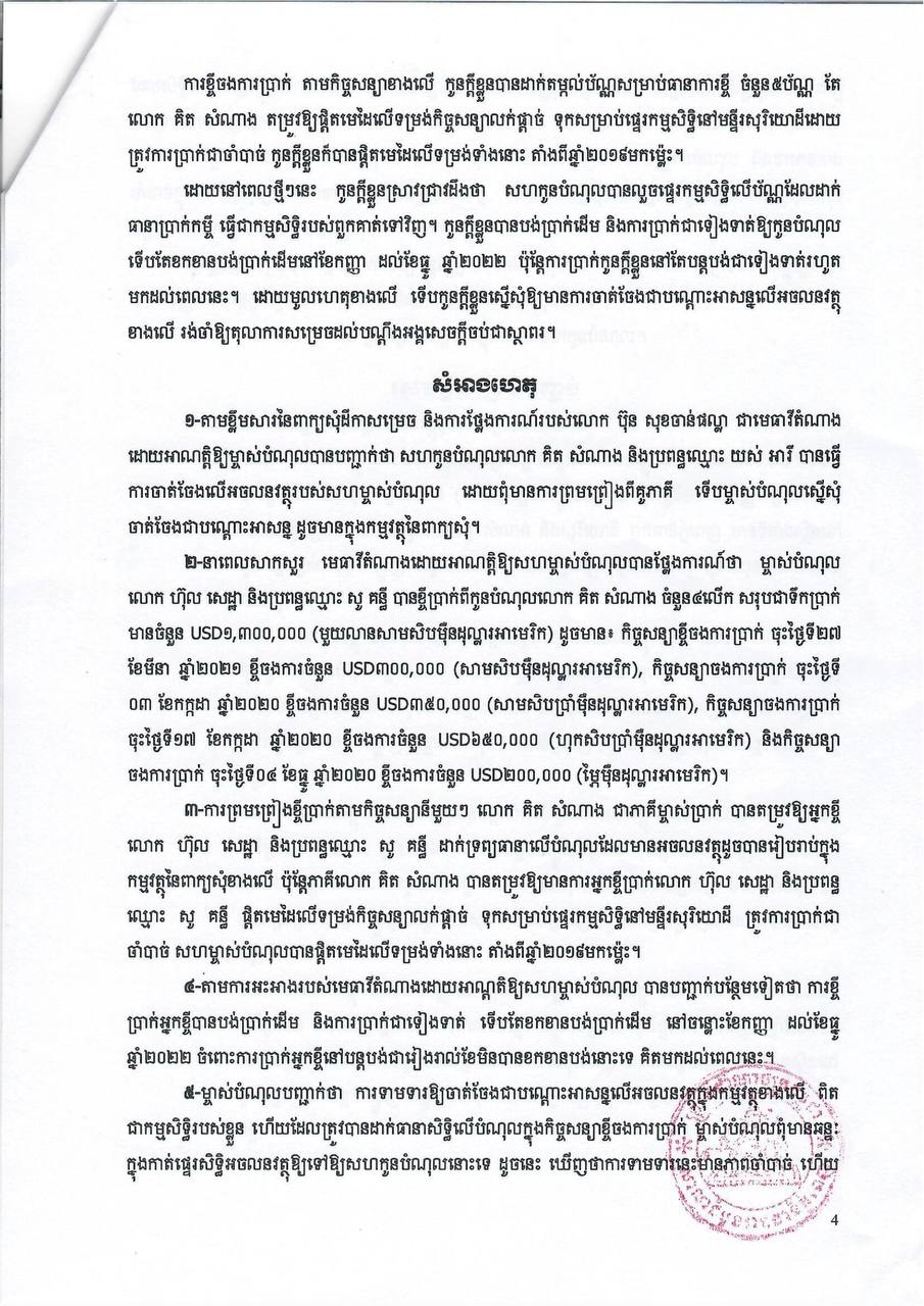 ក្រោយពីទទួលដំណឹងថា ភាគីម្ចាស់បំណុល បានកំពុងធ្វើការផ្ទេរប័ណ្ណកម្មសិទ្ធិដោយគ្មានការឯកភាពពីភាគីកូនបំណុល លោកក៏បានសម្រេចប្ដឹងទៅតុលាការ ដាក់រក្សាការពារ ដើម្បីការពារផលប្រយោជន៍ស្របច្បាប់របស់លោក។ នៅថ្ងៃទី៩ ខែធ្នូ ឆ្នាំ២០២២ ប្រធានសាលាដំបូងរាជធានីភ្នំពេញ លោក តាំង ស៊ុនឡាយ ក៏បានចេញដីកាសម្រេចដីការក្សាការពារជូនលោក។