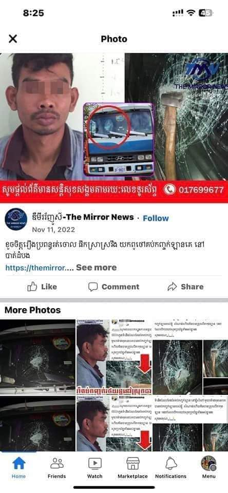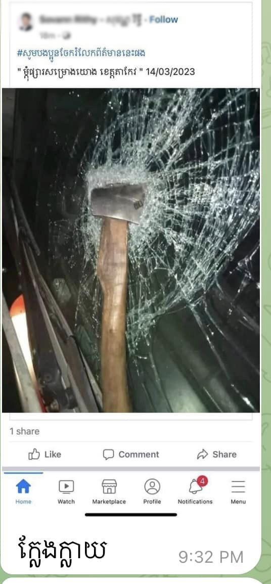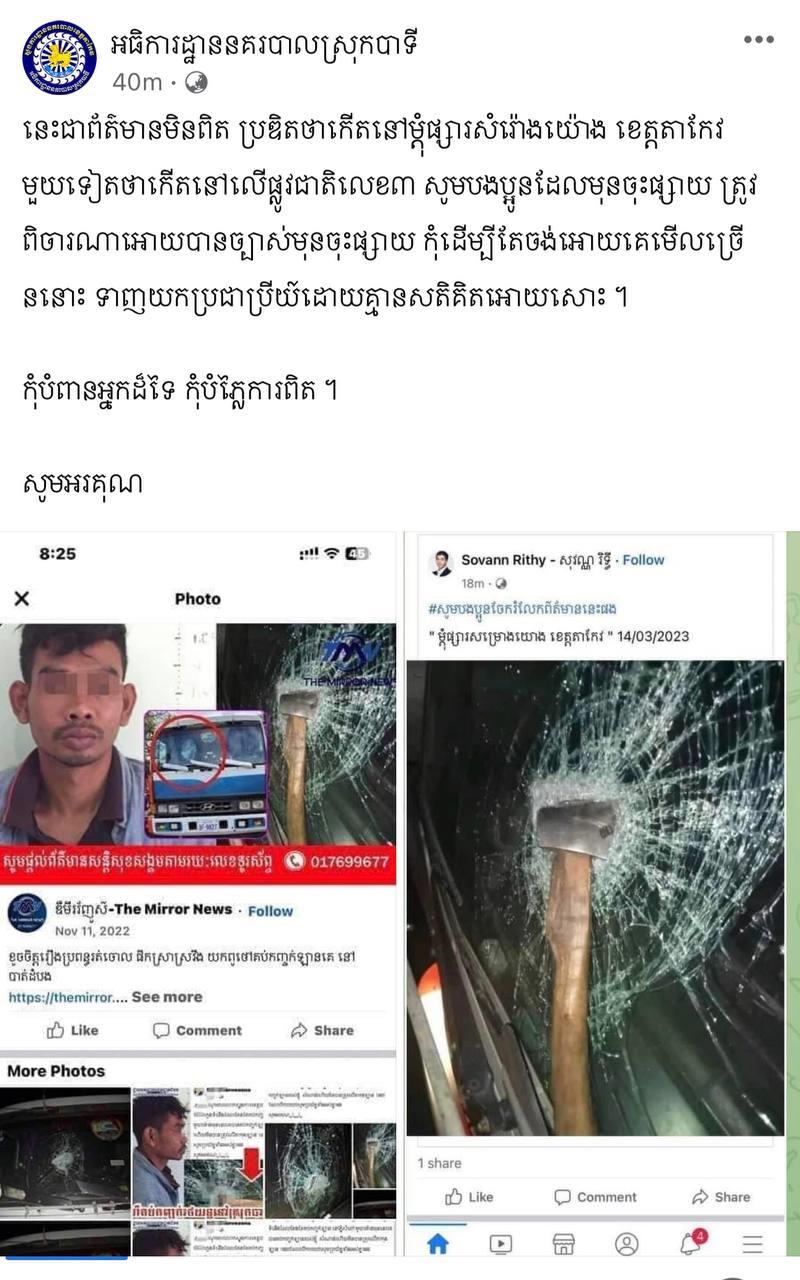 (តាកែវ)៖ អធិការដ្ឋាននគរបាលស្រុកបាទី នៃស្នងការដ្ឋាននគរបាលខេត្តតាកែវ នៅថ្ងៃទី១៤ ខែមីនា ឆ្នាំ២០២៣នេះ បានចេញមកច្រានចោលទាំងស្រុងនូវការផ្សព្វផ្សាយព័ត៌មានប្រឌិតរបស់ Facebook មួយចំនួន ដែលថាមានករណីជនល្មើសប្រើពូថៅ កាប់កញ្ចក់រថយន្តនៅលើផ្លូវជាតិលេខ២ ត្រង់ចំណុចផ្សារសំរោងយ៉ោង ក្នុងស្រុកបាទី ខេត្តតាកែវ។