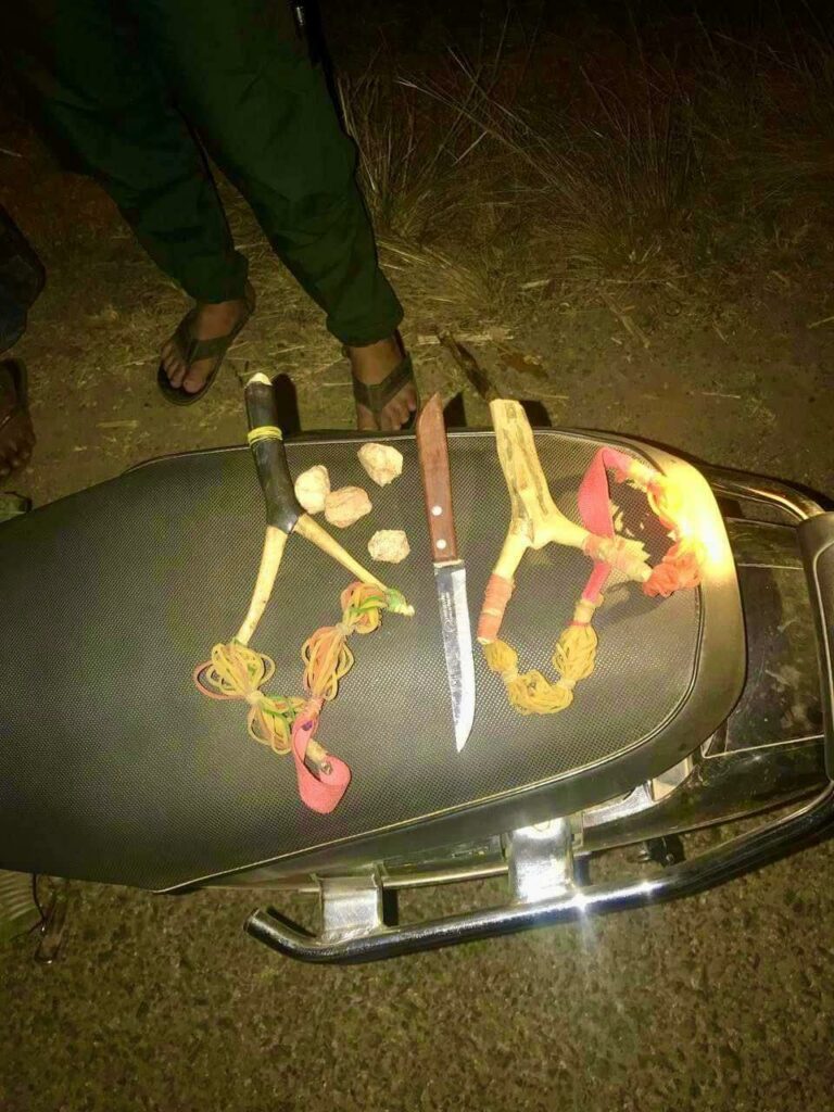 បន្ទាប់ពីសមត្ថកិច្ច​បានឃាត់សាកសួ​រនិងពិនិត្យ​ ម៉ូតូម៉ាកអ៊ិចស៊ីទ័រពណ៌ខៀវគ្មានឯកសារ​ ជិះគ្នាពីរនាក់ និងម៉ូតូម៉ាកហុងដាឌ្រីមពណ៌ខ្មៅស្លាកលេខកំពង់ស្ពឺ 1I-4633 ជិះម្នាក់ឯង កម្លាំងសមត្ថកិ​ច្ចឆែកឆេររកឃើញឧបករណ៍សម្ភារ​រួមជា​មួយកូនកាំបិតចុងស្រួច​១​ ជំពាមកៅស៊ូ២​ គ្រាប់ជំពាម៤គ្រាប់​ ដុំថ្ម​ច្រកថង់​។