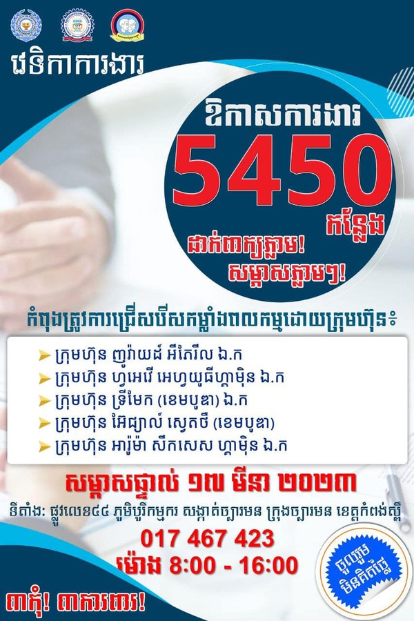 ដូច្នេះ សូមបងប្អូនកម្មករ កម្មការិនី ដែលចង់បានការងារធ្វើ ឬចង់ផ្លាស់ប្តូរការងារ កុំភ្លេចត្រៀមចូលរួមឲ្យបានរួសរាន់ ដើម្បីដាក់ពាក្យស្វែងរកការងារធ្វើជាមួយបណ្តារោងចក្រ សហគ្រាសដែលកំពុងមាន​តម្រូវការជ្រើសរើសកម្លាំងពលកម្មជាច្រើននាក់។
