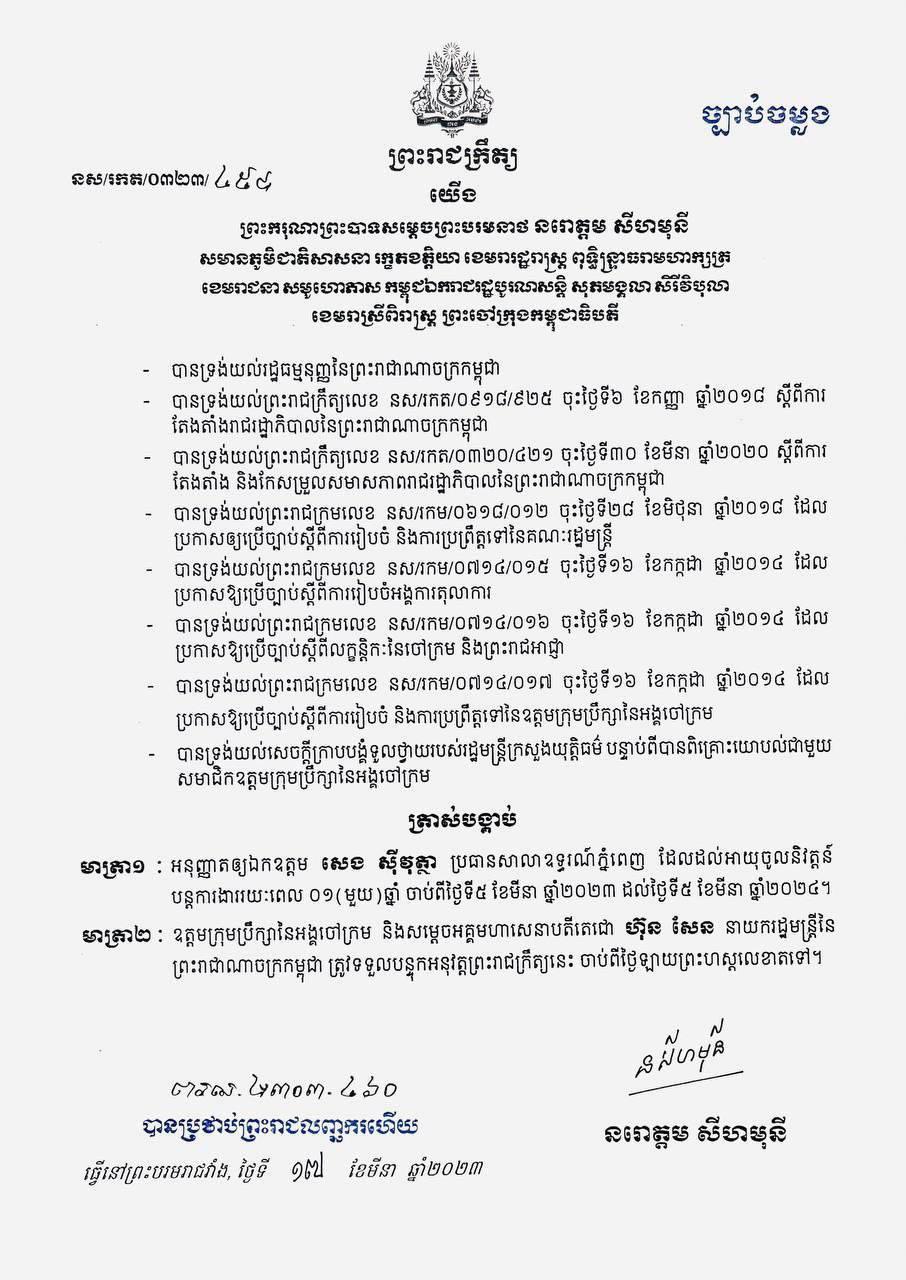 (ភ្នំពេញ)៖ ព្រះករុណា ព្រះបាទ សម្តេចព្រះ បរមនាថ ន​រោត្តម សីហមុនី ព្រះមហាក្សត្រនៃព្រះរាជាណាចក្រកម្ពុជា បានចេញព្រះរាជក្រឹត្យត្រាស់បង្គាប់អនុញ្ញាតឲ្យលោក សេង ស៉ីវុត្ថា ប្រធានសាលាឧទ្ធរណ៍ភ្នំពេញ ដែលដល់អាយុចូលនិវត្តន៍ អាចបន្តការងាររយៈពេល១ឆ្នាំទៀត ចាប់ពីថ្ងៃទី៥ ខែមីនា ឆ្នាំ២០២៣ ដល់ថ្ងៃទី៥ ខែមីនា ឆ្នាំ២០២៤៕ ផ្តល់សិទ្ធិដោយ៖ Fresh News